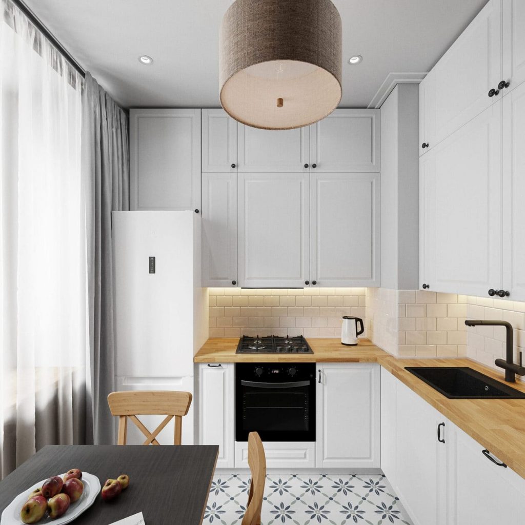 Белые фасады гарнитура с классическими рамками отлично сочетаются с деревянными столешницами. Высокие шкафы используют пространство по максимуму — ничего лишнего, всё по делу. Плитка «кабанчик» и чёрная сантехника добавляют контраста и делают кухню современной.