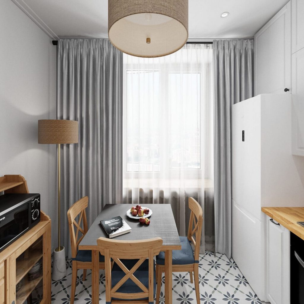 Обеденная зона оформлена просто, но со вкусом: деревянный стол, мягкие подушки на стульях, торшер и текстиль создают домашнюю атмосферу.