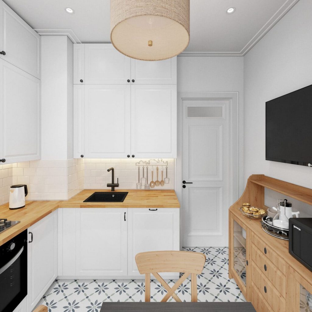 Пол с геометрическим орнаментом — ещё один акцент, который оживляет светлую палитру и делает кухню выразительной.