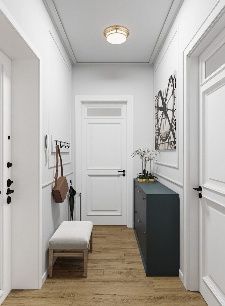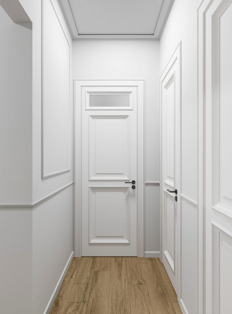 В прихожей белые двери с фрезеровкой, молдинги и потолочный декор создают сдержанную классику, а тёплый пол под дерево добавляет уюта.
