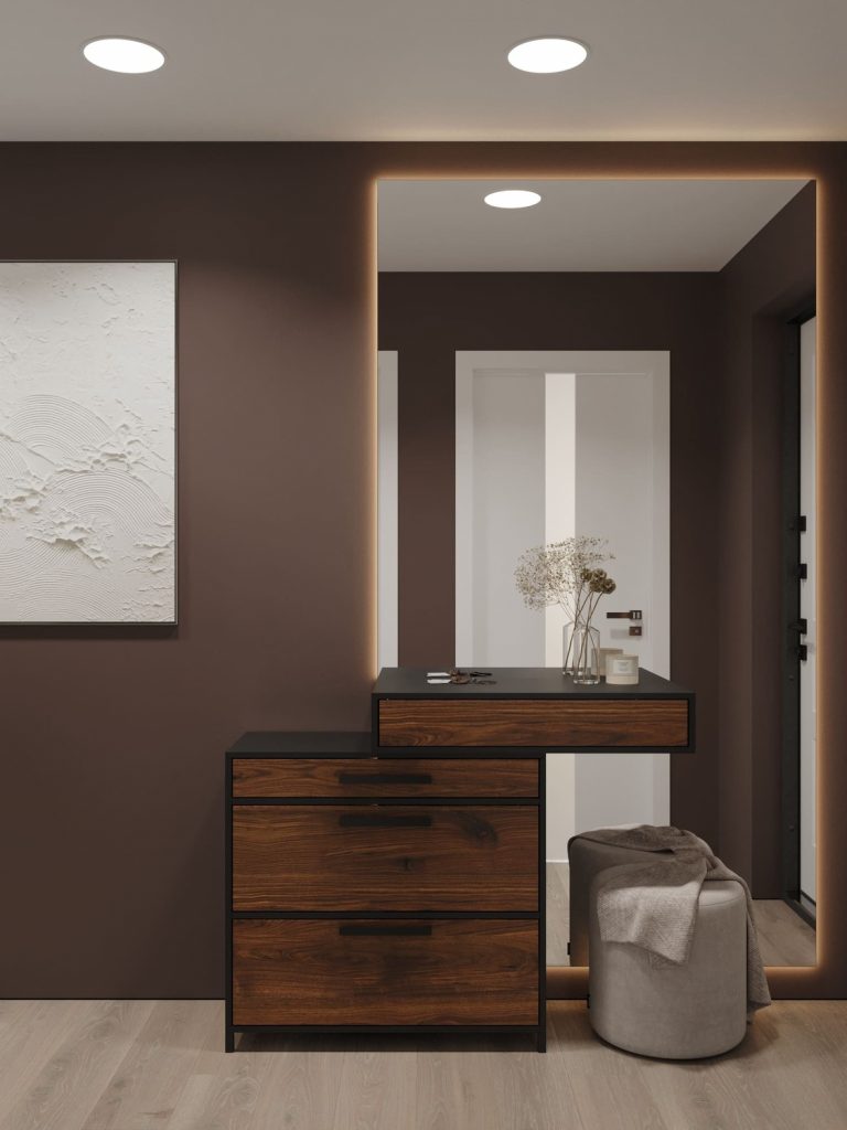 Большое зеркало с подсветкой визуально расширяет пространство и делает прихожую светлее. Интегрированное освещение добавляет мягкости и создаёт эффект «парящей» поверхности. Встроенные точечные светильники обеспечивают равномерное освещение, подчёркивая структуру стен и предметов декора.