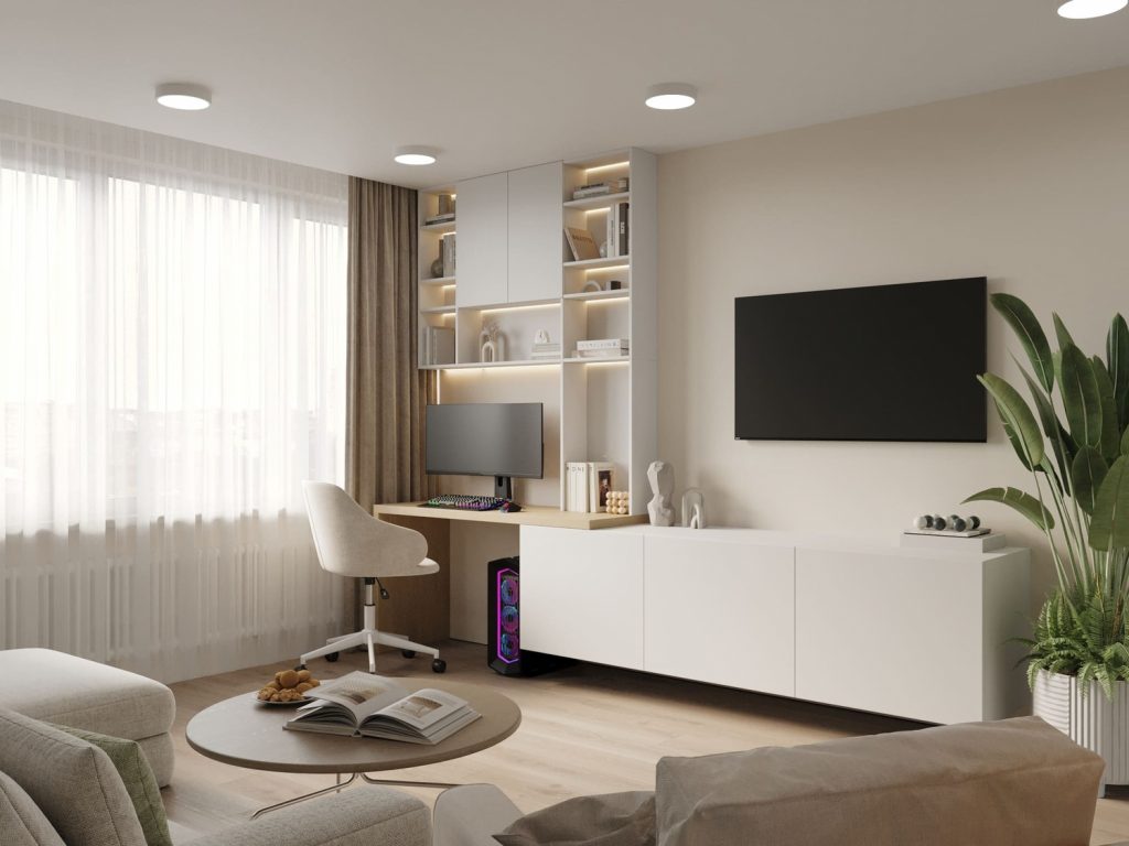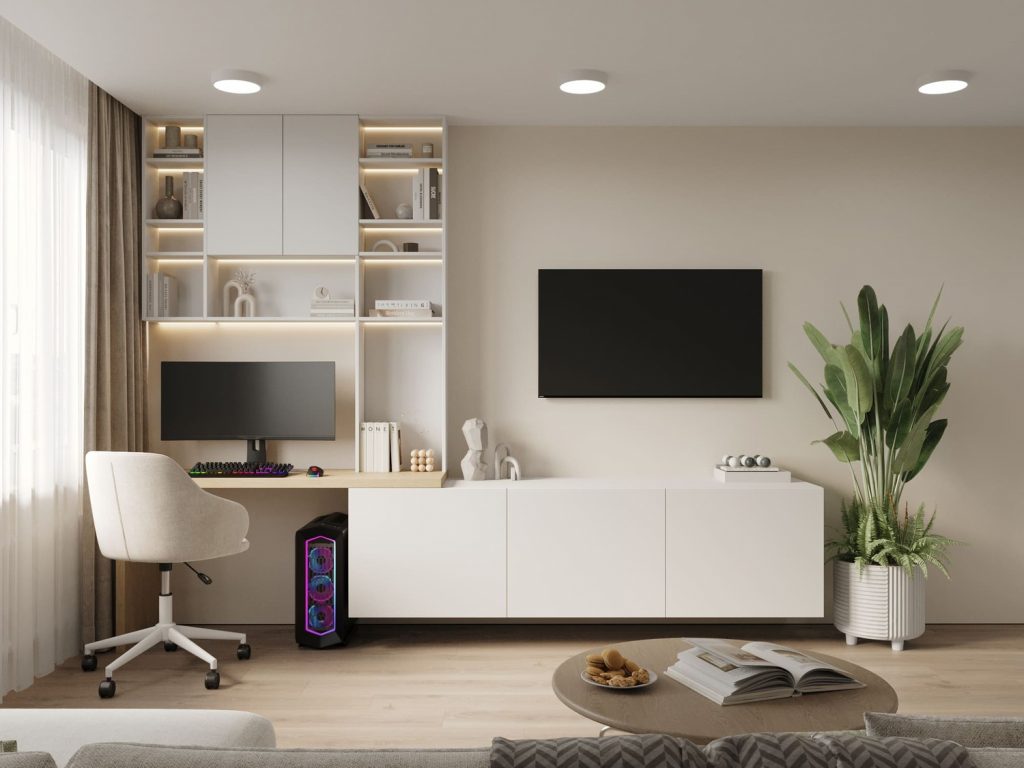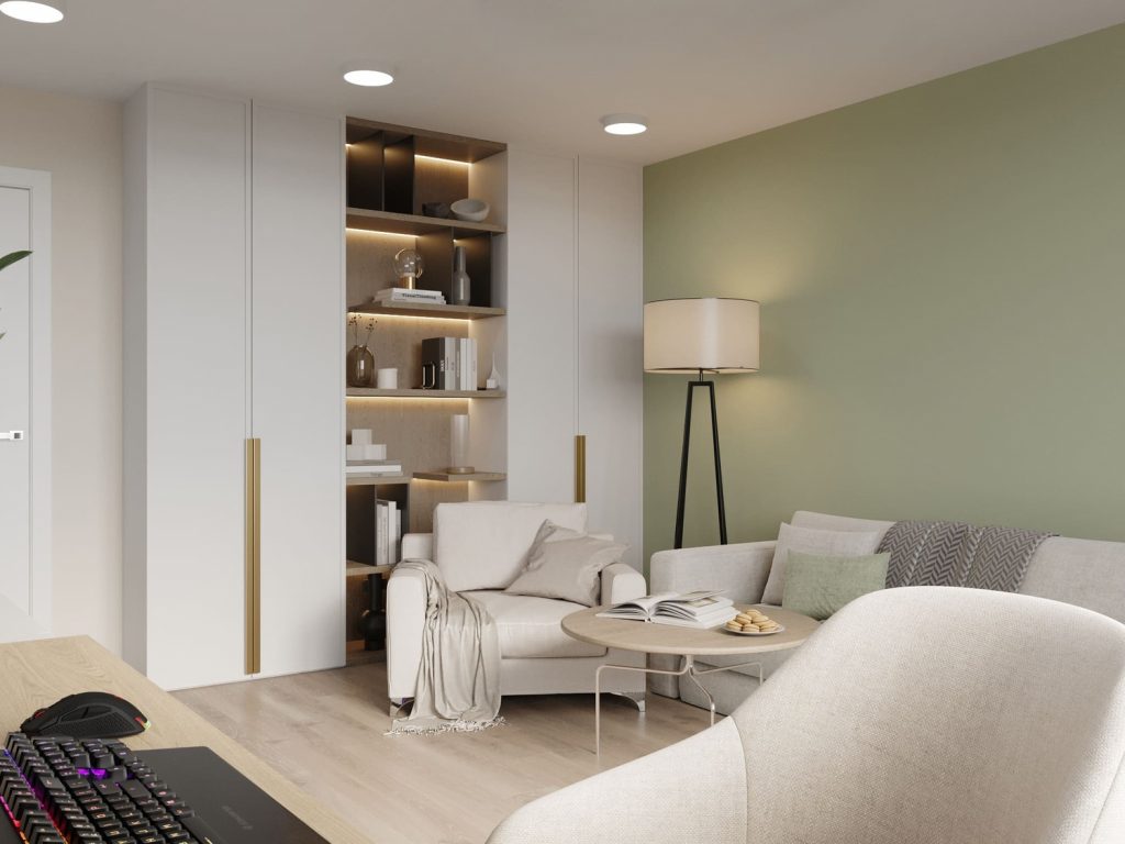 Эта гостиная объединяет в себе две важные функции: место для комфортного отдыха и рабочую зону. Интерьер оформлен в светлых природных оттенках с акцентами свежей зелени, что создает атмосферу спокойствия и уюта.