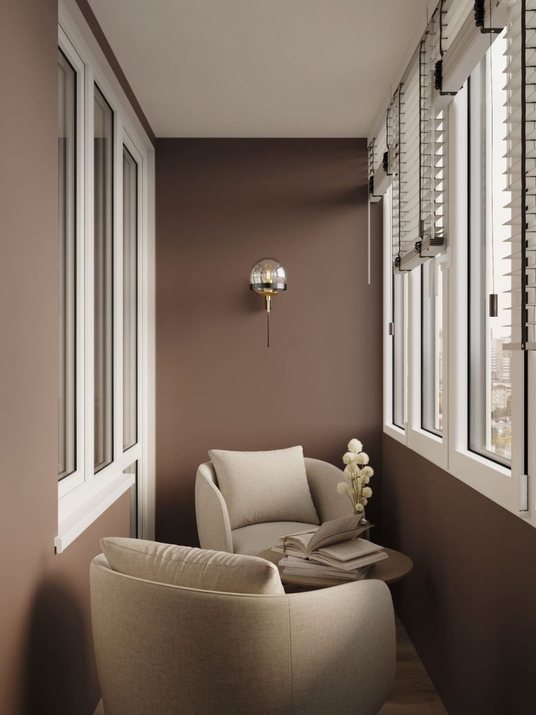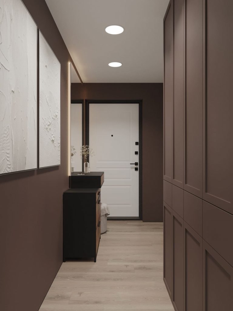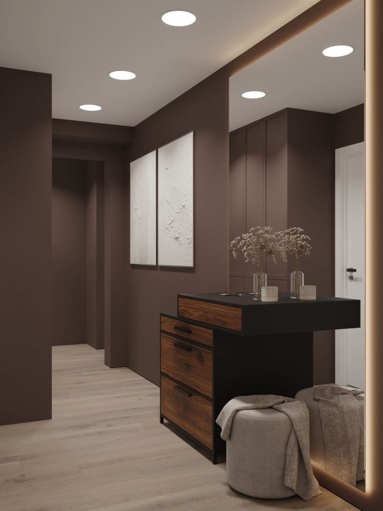Стены выполнены в глубоком шоколадном оттенке, который создает камерное, расслабляющее настроение. Светлая мебель и натуральное дерево в деталях добавляют мягкости и уюта, гармонично сочетаясь с цветовой палитрой всей квартиры.
