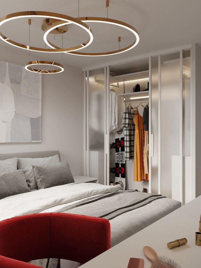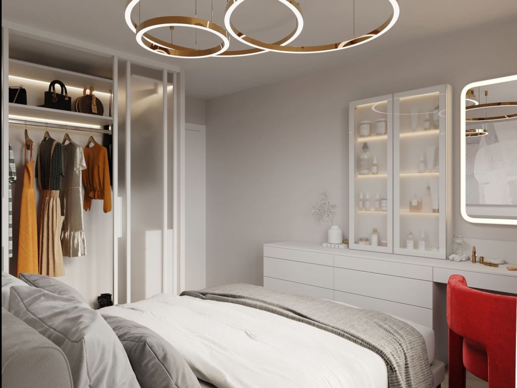 Продуманная система хранения решает вопрос организации пространства. Вместительный встроенный шкаф с раздвижными дверцами и подсветкой внутри делает хранение вещей удобным и эстетичным. Прозрачные вставки создают легкость и визуально расширяют пространство.