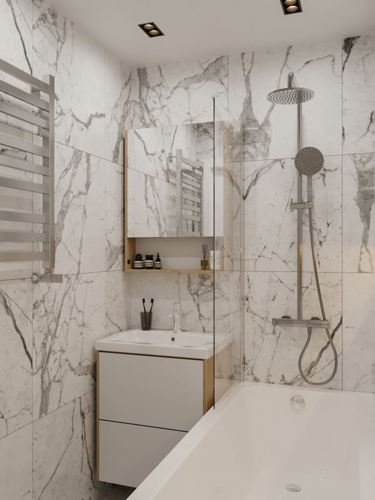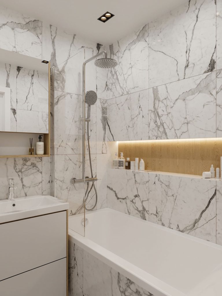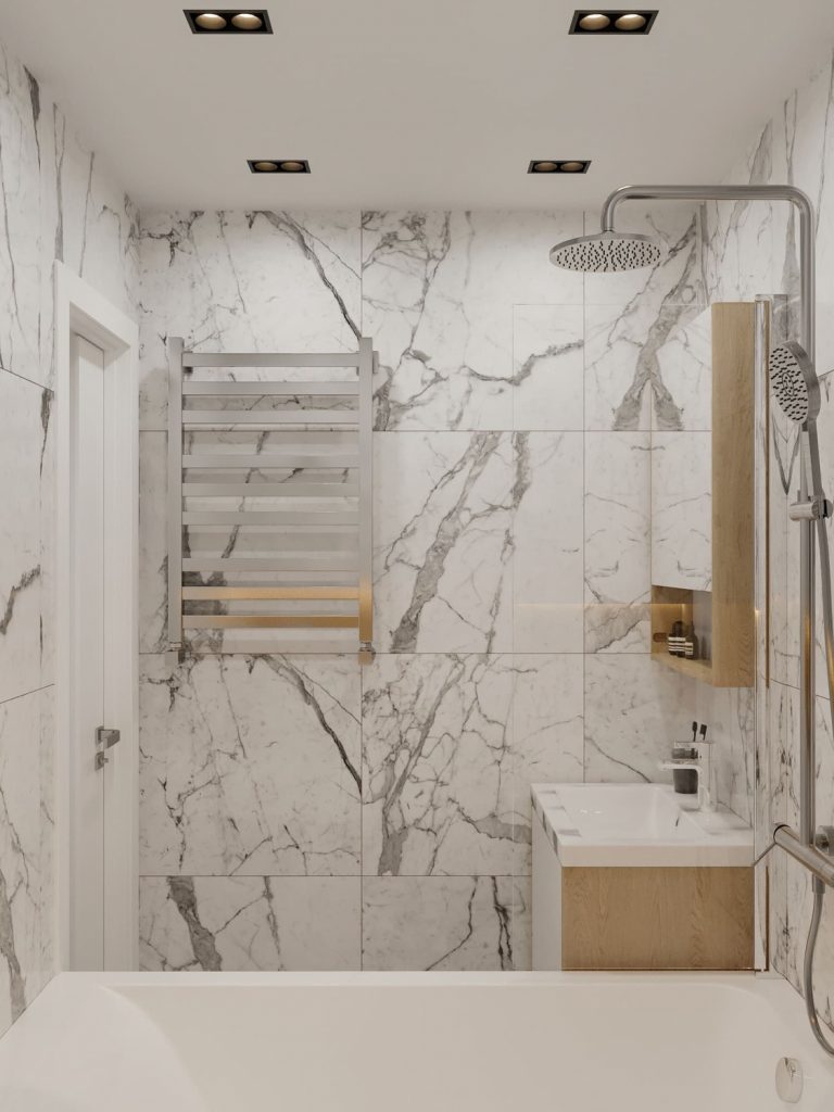 Крупноформатные мраморные плиты на стенах и полу создают цельную картину, а их естественная текстура добавляет интерьеру выразительности. Благодаря минимальному количеству стыков помещение выглядит аккуратным и стильным.