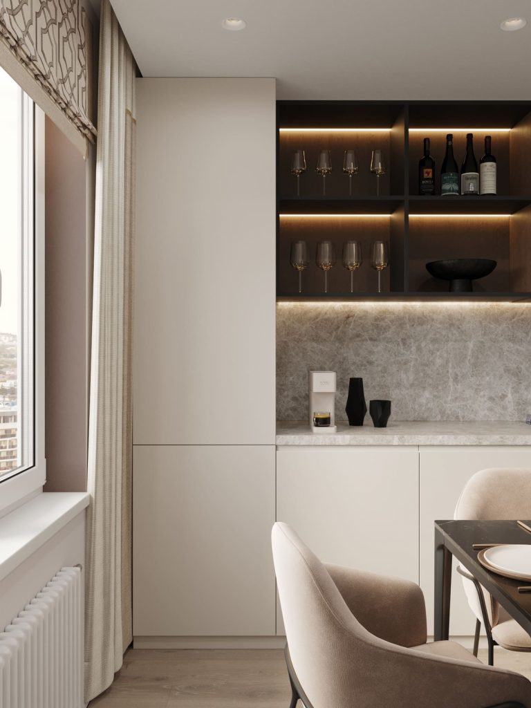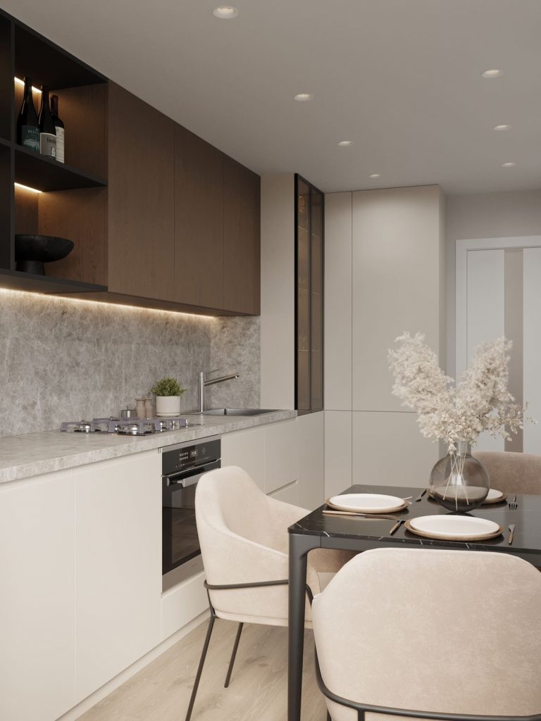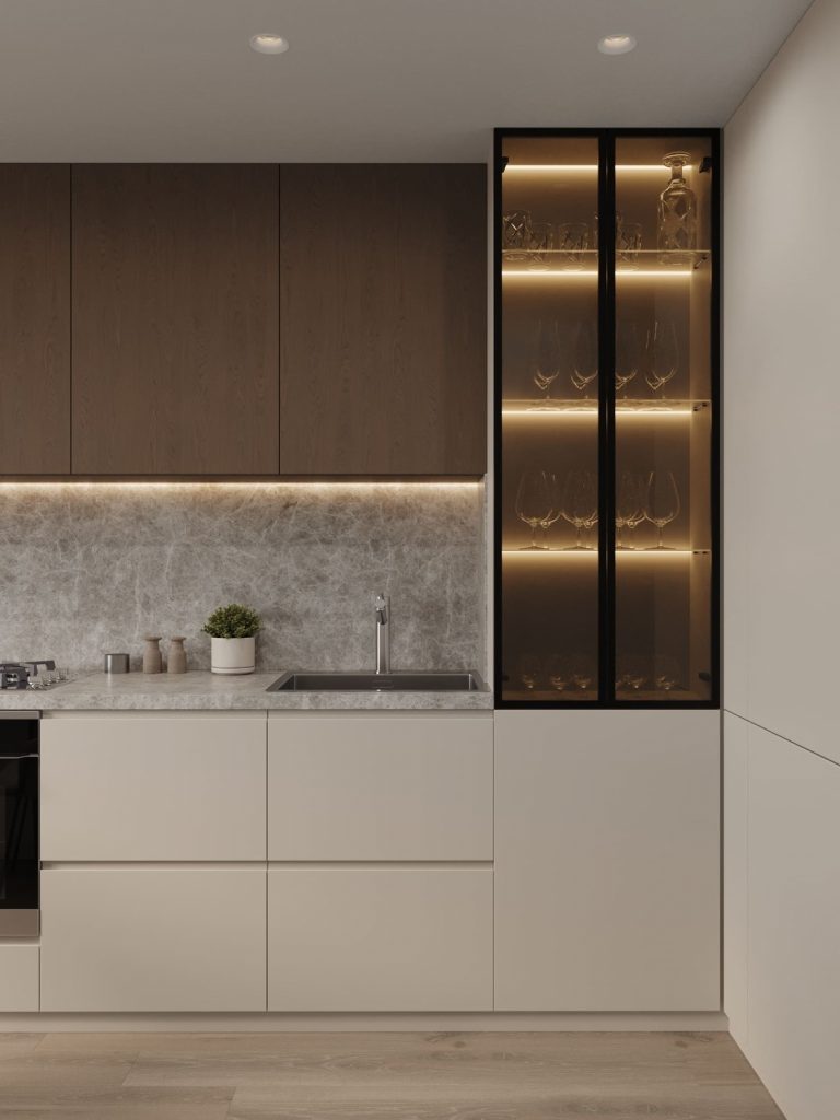 Лаконичная кухонная линия со встроенной бытовой техникой и скрытой системой хранения обеспечивает удобство в использовании и поддержании порядка. Верхние шкафы с деревянными фасадами добавляют естественной текстуры, а открытые полки с подсветкой создают атмосферу уюта и позволяют держать под рукой самые необходимые вещи. Встроенный стеклянный шкаф с подсветкой предназначен для хранения посуды и делает интерьер более выразительным.