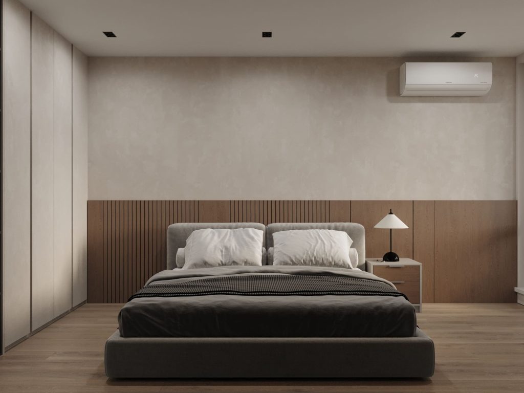 Центральный элемент спальни — мягкая кровать с невысоким серым изголовьем. Фактурная стена за кроватью оформлена деревянными панелями с вертикальным ритмом, что добавляет глубины пространству и подчеркивает природную концепцию интерьера. Светильники с черными акцентами привносят графичность и стильный контраст.