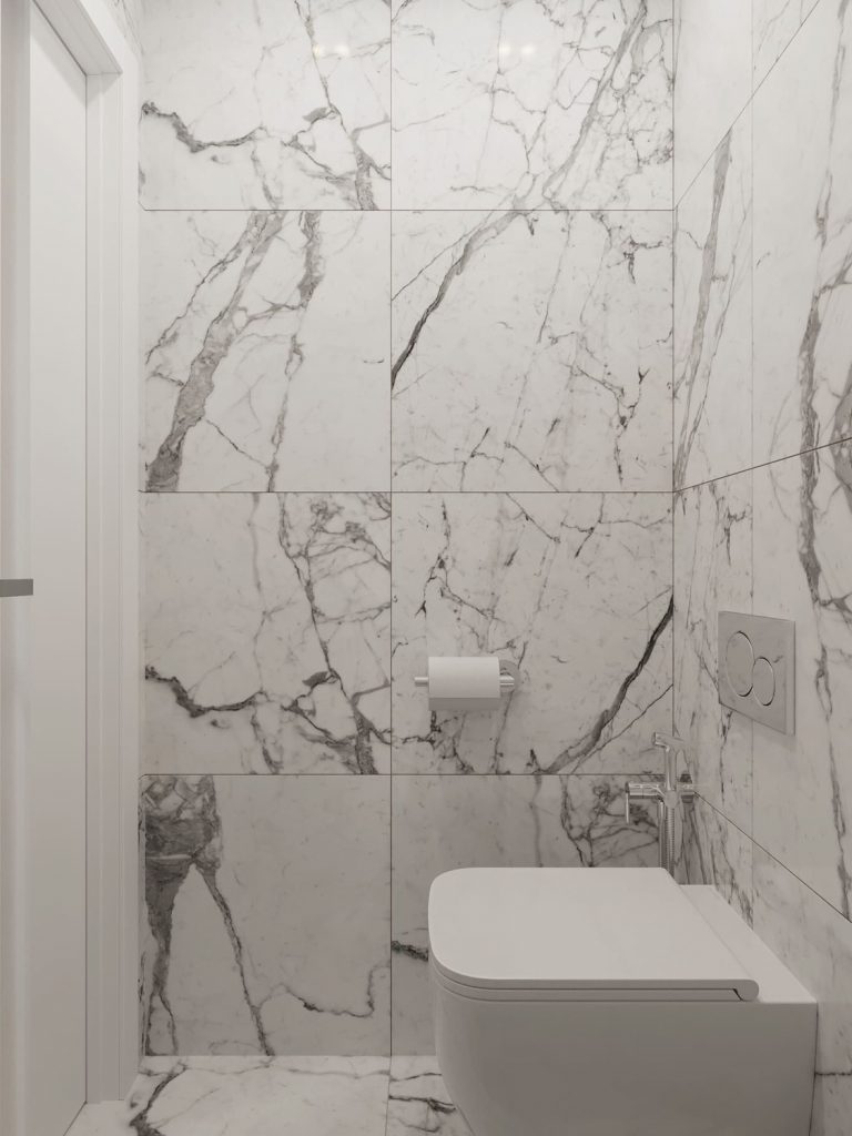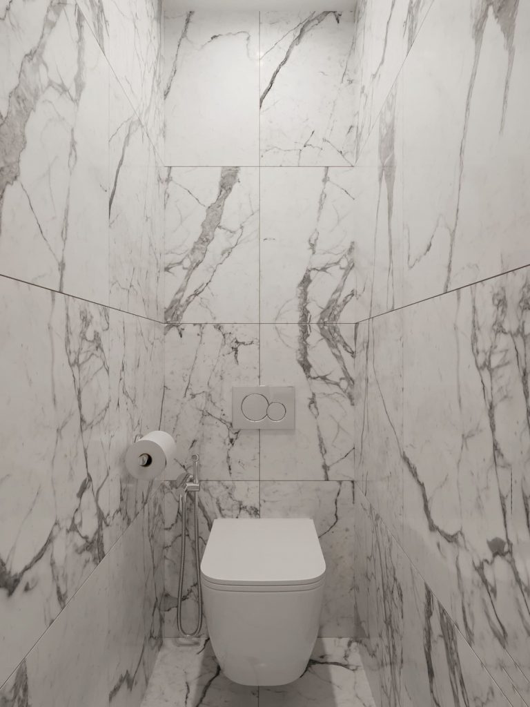 Этот санузел оформлен в минималистичном стиле, где главную роль играет текстура натурального камня. Мраморная отделка с выразительными прожилками придает пространству элегантность, а отсутствие лишних деталей делает интерьер визуально легким и просторным.