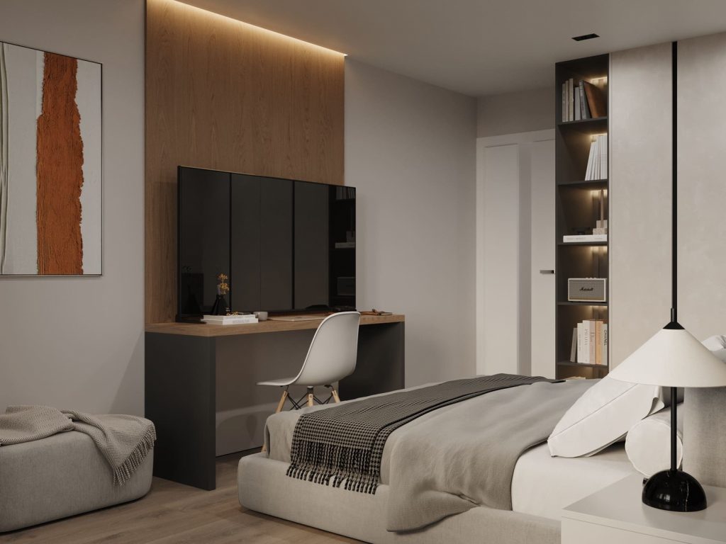 В спальне организовано рабочее место с удобным столом, встроенным в композицию ТВ-зоны. Деревянная панель с подсветкой за телевизором делает интерьер более уютным, а открытые стеллажи с теплым освещением добавляют глубины и стиля. Стул с лаконичным дизайном поддерживает эстетику минимализма, обеспечивая комфорт во время работы.