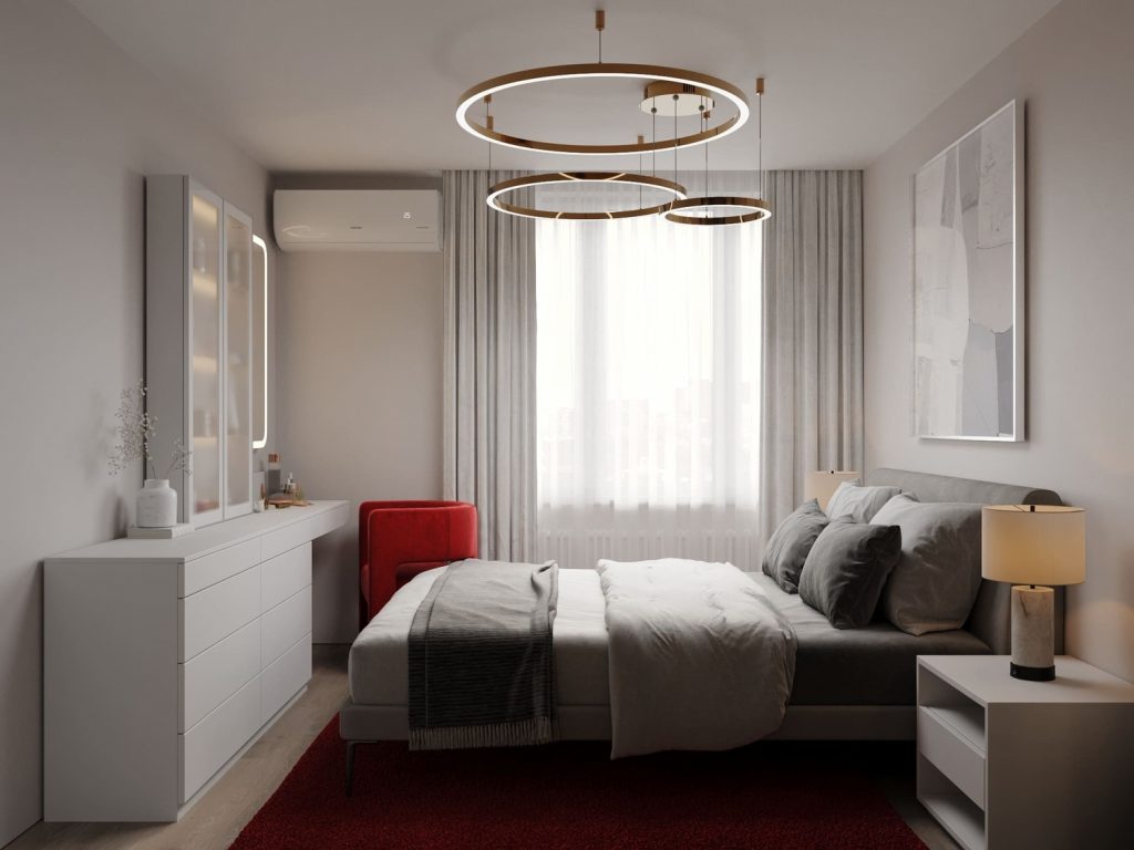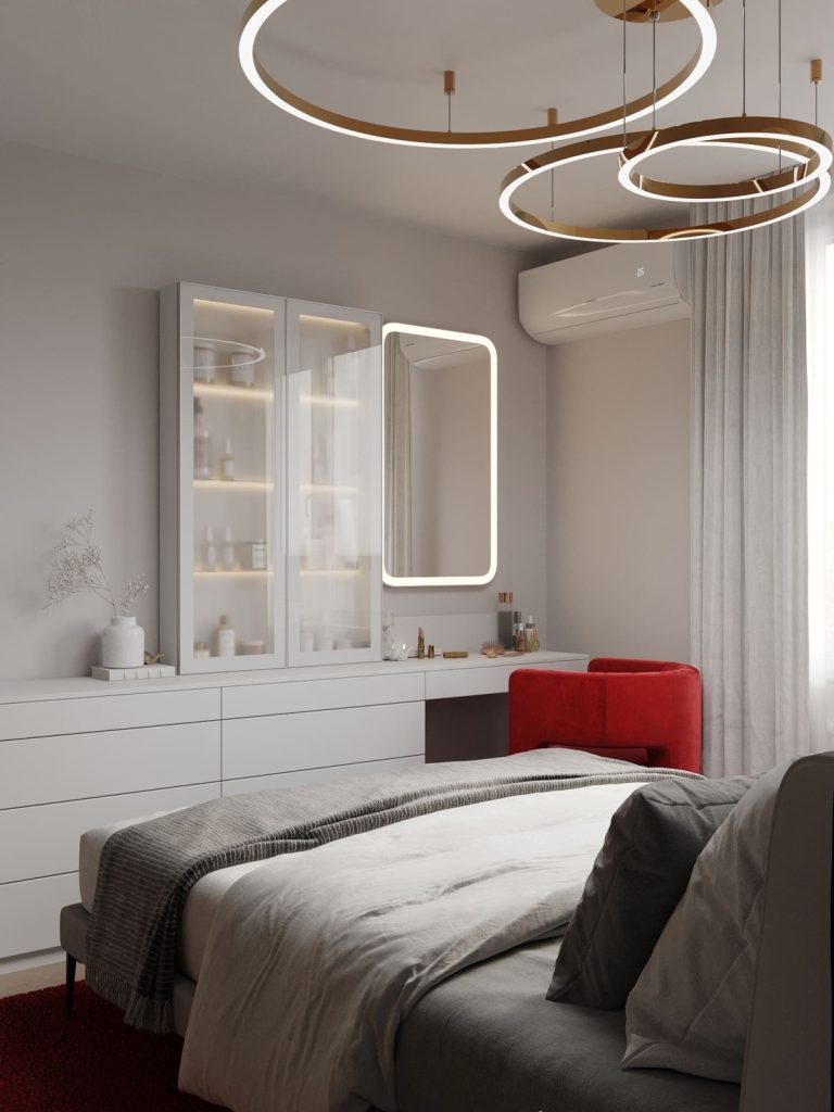 Красный ковер и стильное кресло добавляют комнате динамику и контраст. Эти элементы подчеркивают индивидуальность хозяйки и делают интерьер более выразительным, сохраняя при этом гармонию цветового баланса.