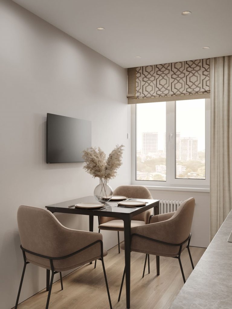 Компактный стол и мягкие стулья с изящными металлическими ножками создают уютный уголок для завтраков и ужинов. Окно оформлено текстилем в бежевых тонах, который делает пространство еще более теплым и домашним. Римская штора с геометрическим рисунком добавляет интерьеру ритм и легкую декоративность.