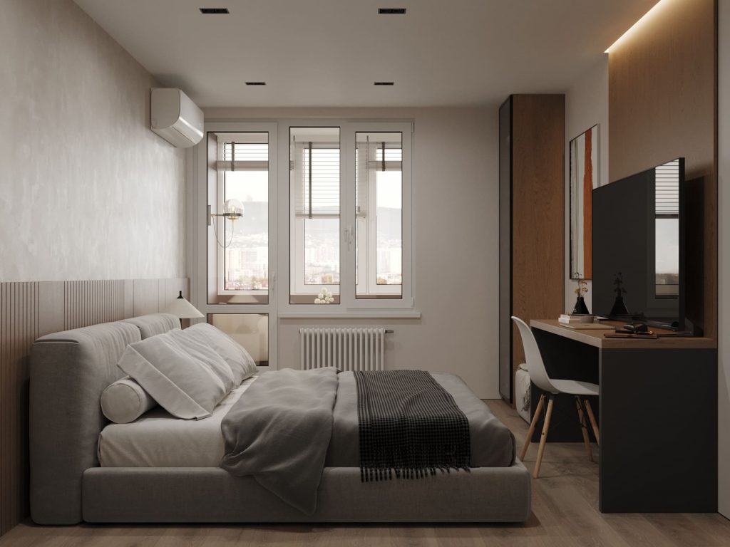 Большие окна наполняют комнату естественным светом, а встроенные потолочные светильники обеспечивают равномерное освещение в вечернее время. Настенные бра у кровати создают мягкий свет для чтения и расслабления перед сном.