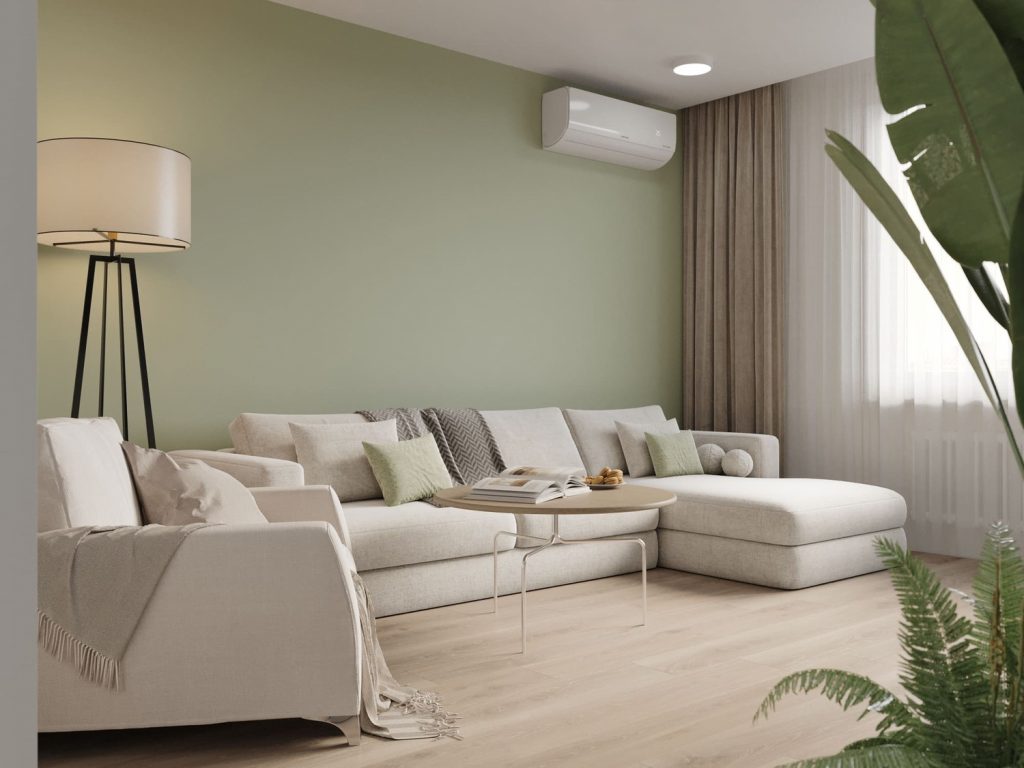 Центром композиции стал большой угловой диван в светлом текстиле, дополненный декоративными подушками и пледом. Стена за диваном окрашена в мягкий зеленый оттенок, создающий эффект природного уюта. Светильник с графичным металлическим основанием добавляет легкость в интерьер и обеспечивает приятное рассеянное освещение.