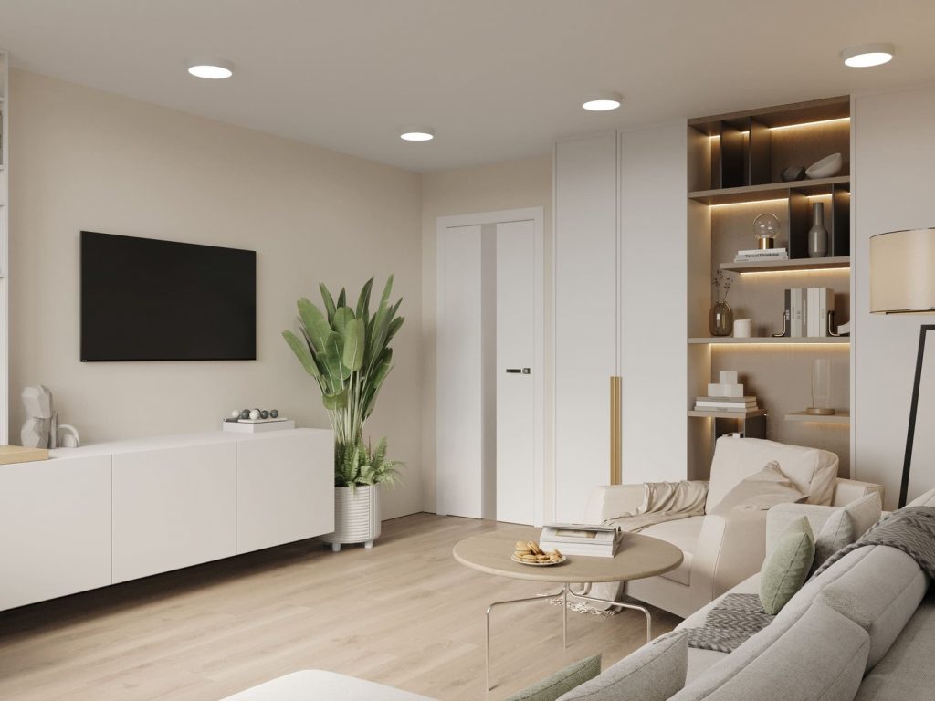 Телевизионная зона оформлена минималистично — подвесной белый модуль аккуратно скрывает все лишнее, оставляя пространство легким и воздушным. Напольные растения оживляют интерьер и подчеркивают его естественную цветовую палитру.