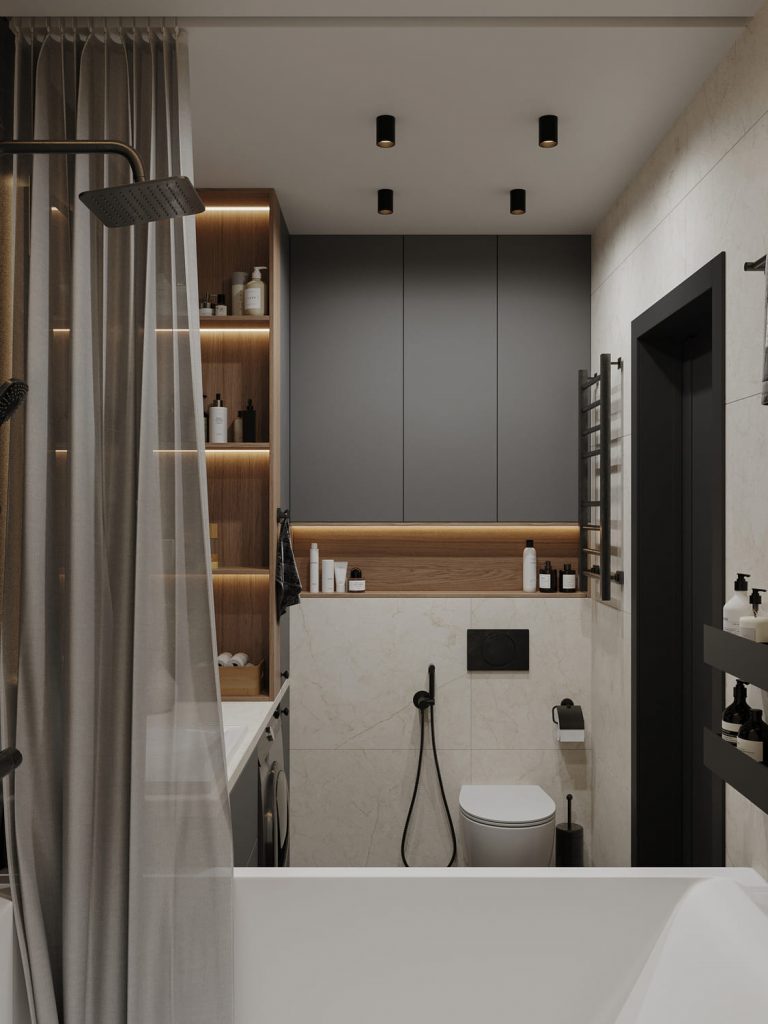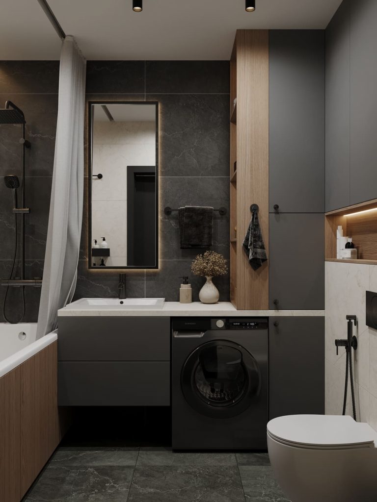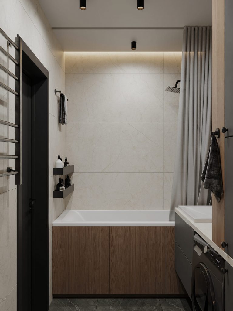 Вдоль стены разместилась удобная ванна с экраном под дерево — это добавляет тепла в общий образ и поддерживает единую концепцию квартиры. Рядом — зона умывальника с вместительными шкафами и стиральной машиной, аккуратно встроенной в композицию.