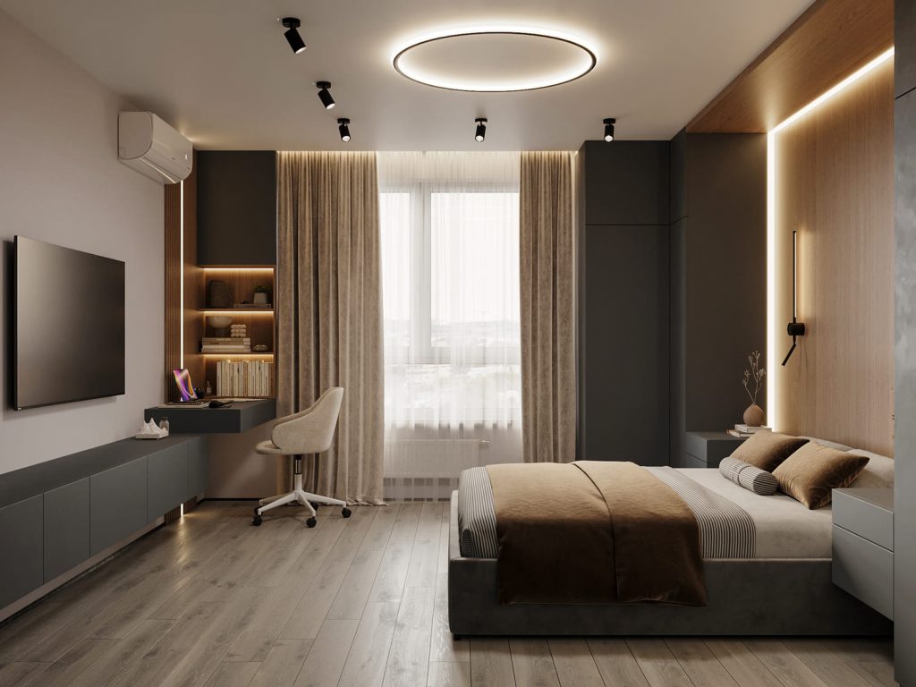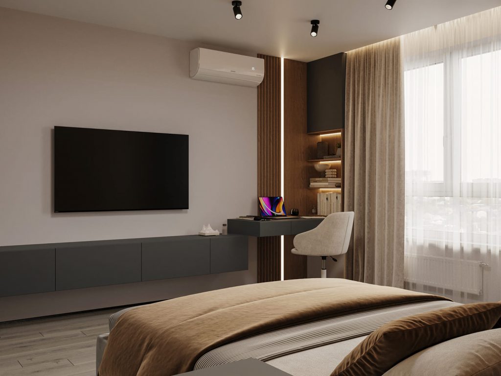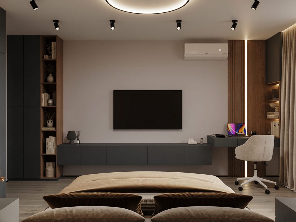 Особое внимание уделено хранению: встроенные шкафы с ровными фасадами не перегружают пространство, оставаясь максимально незаметными. В комнате предусмотрено и рабочее место — компактный стол с полками и подсветкой удобно встроен в нишу у окна. Благодаря этому спальня сочетает сразу несколько сценариев: от работы за ноутбуком до вечернего отдыха перед телевизором.