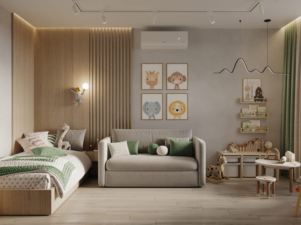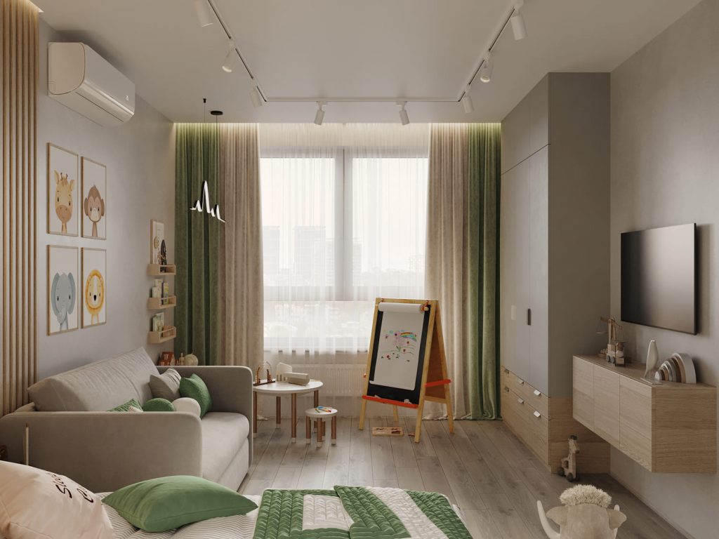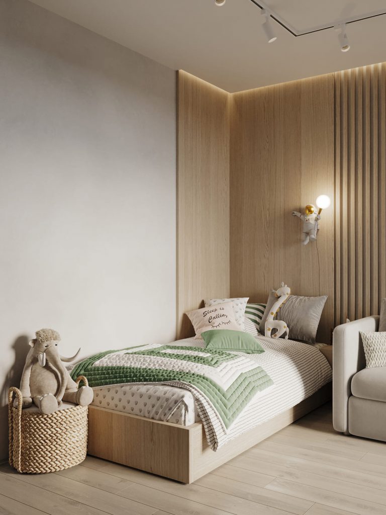 Основной акцент сделан на стене с деревянными панелями и мягкой подсветкой. Здесь расположена кровать с текстилем в зелёно-белой гамме — свежие оттенки добавляют лёгкости и ассоциируются с природой. Забавные светильники и мягкие игрушки создают атмосферу игры и уюта, превращая пространство в маленький мир ребёнка.