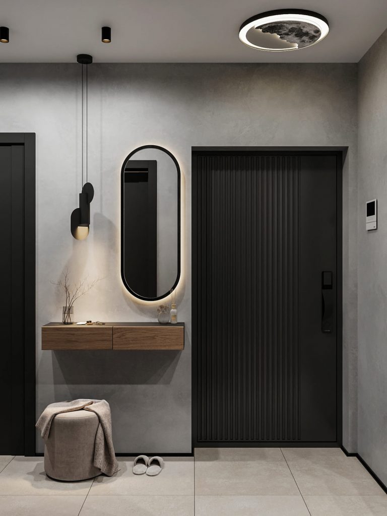 Противоположная стена оформлена лаконичной консолью и овальным зеркалом с подсветкой. Такой приём визуально расширяет пространство и создаёт уютный световой акцент. Атмосферу поддерживает необычный потолочный светильник с декоративной вставкой и точечные чёрные светильники, подчеркивающие современный характер интерьера.