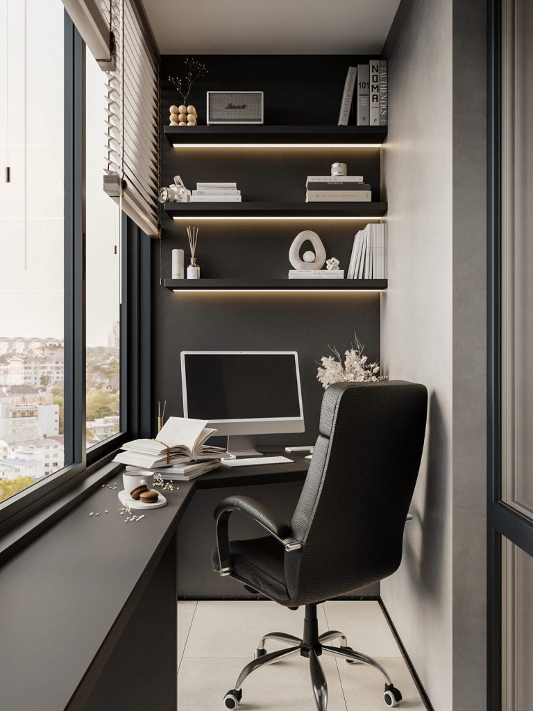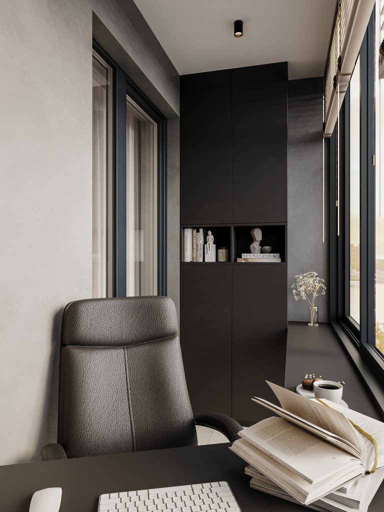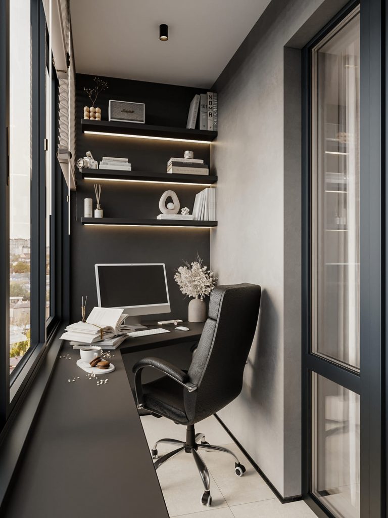 Балкон в этом проекте превратился в полноценный рабочий кабинет — компактный, но максимально функциональный. Вдоль окна разместилась длинная рабочая поверхность — за ней удобно работать с ноутбуком или бумагами. Лаконичный чёрный стол в сочетании с эргономичным креслом создаёт атмосферу современного домашнего офиса. На стене — открытые полки с подсветкой, где можно хранить книги, документы или любимый декор. Дополняет композицию встроенный шкаф, который позволяет поддерживать порядок и скрывать всё лишнее.
