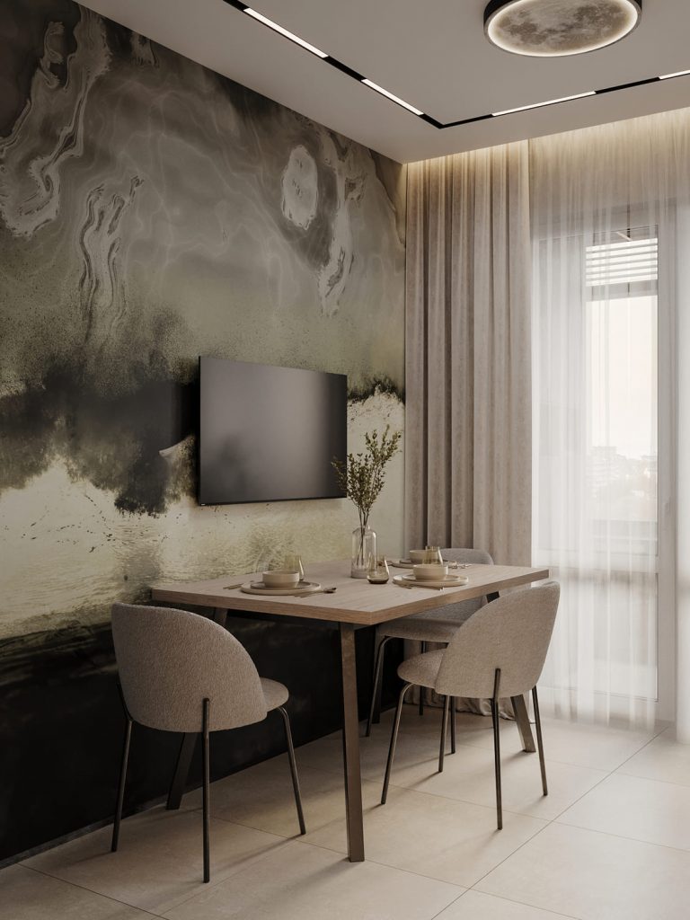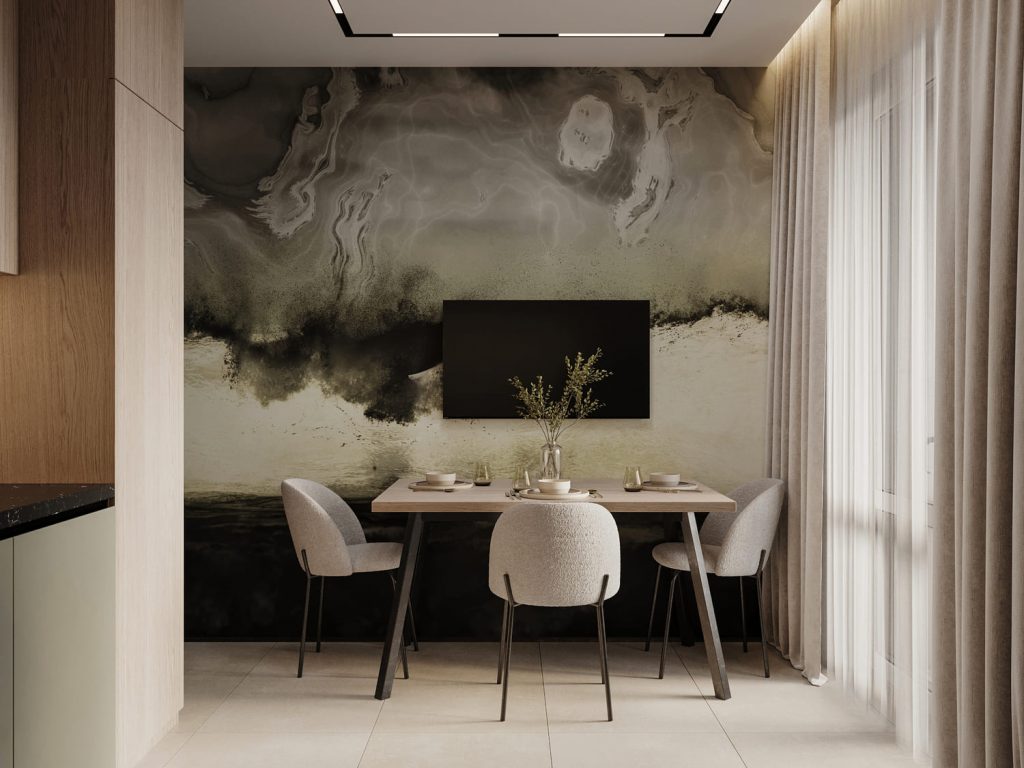 Основной акцент здесь сделан на стене с фотообоями: её глубокий рисунок создаёт ощущение перспективы и визуально расширяет пространство. Благодаря этому даже компактная зона выглядит просторнее и интереснее.