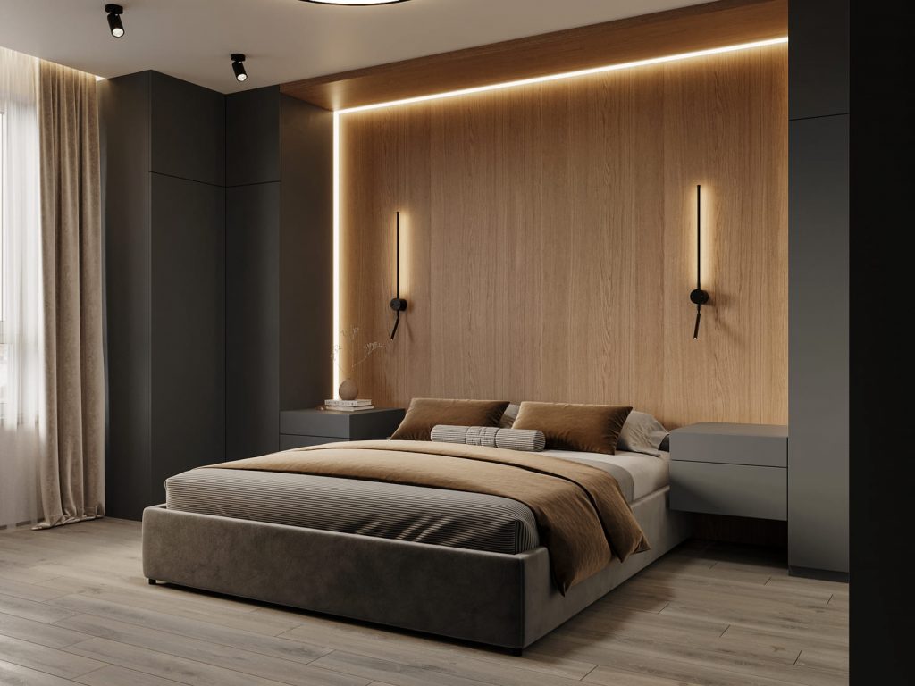 Центральный акцент — стена за изголовьем кровати, оформленная тёплыми деревянными панелями с мягкой подсветкой по периметру. Она создаёт камерную атмосферу, а встроенные светильники по бокам делают зону уюта ещё более выразительной.