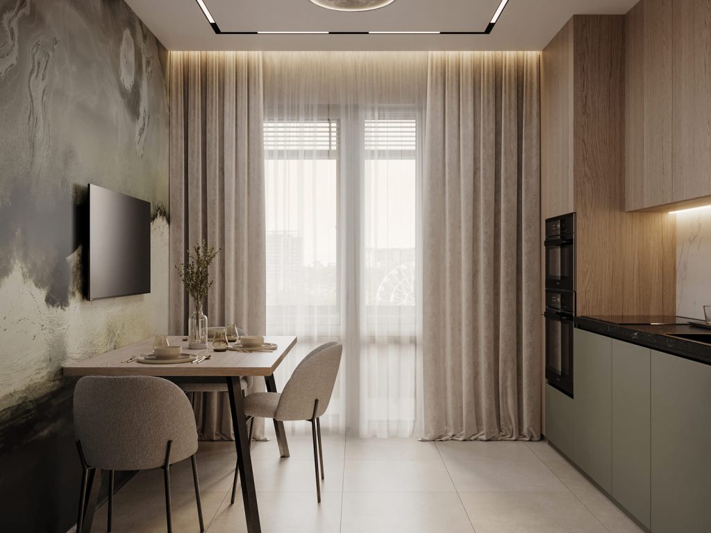 Обеденная зона оформлена лаконично: деревянный стол, мягкие стулья с обивкой приятного серого оттенка и лёгкий декор. Вечером, когда включается потолочная подсветка с декоративным светильником, кухня преображается, превращаясь в уютное место для семейных ужинов или неспешных завтраков у окна.