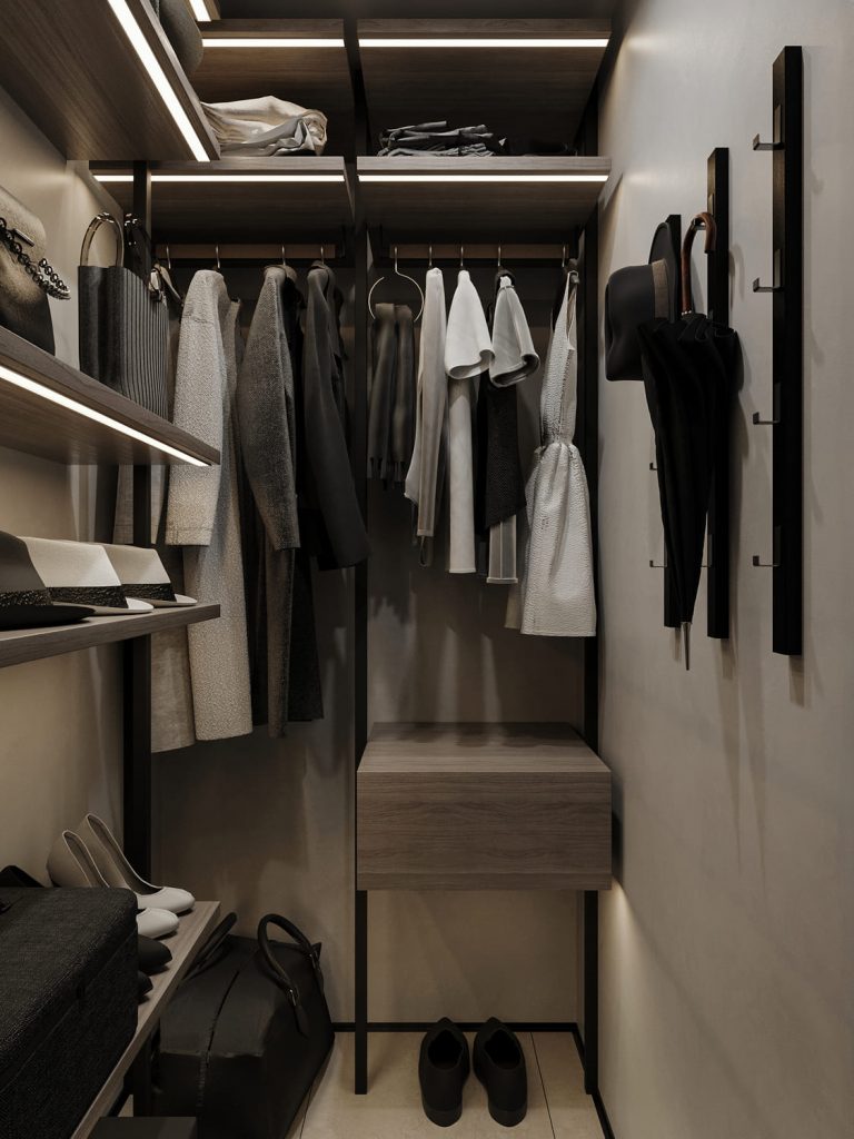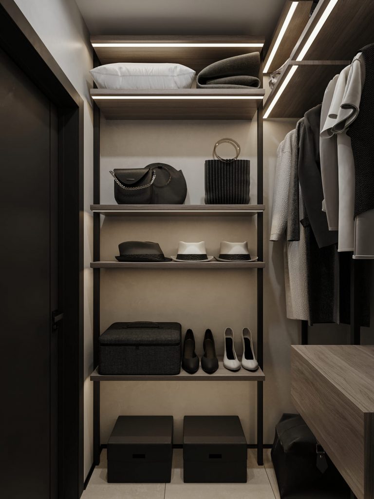 Открытые полки с подсветкой создают ощущение лёгкости и помогают быстро найти нужные вещи. На вешалах — одежда для любого случая, от повседневной до более торжественной. Нижние секции отведены под обувь и аксессуары, а компактные боксы позволяют хранить мелочи в идеальном порядке. Небольшие детали — крючки для сумок и зонтов, аккуратные ящики для хранения — делают пространство функциональным и завершённым.