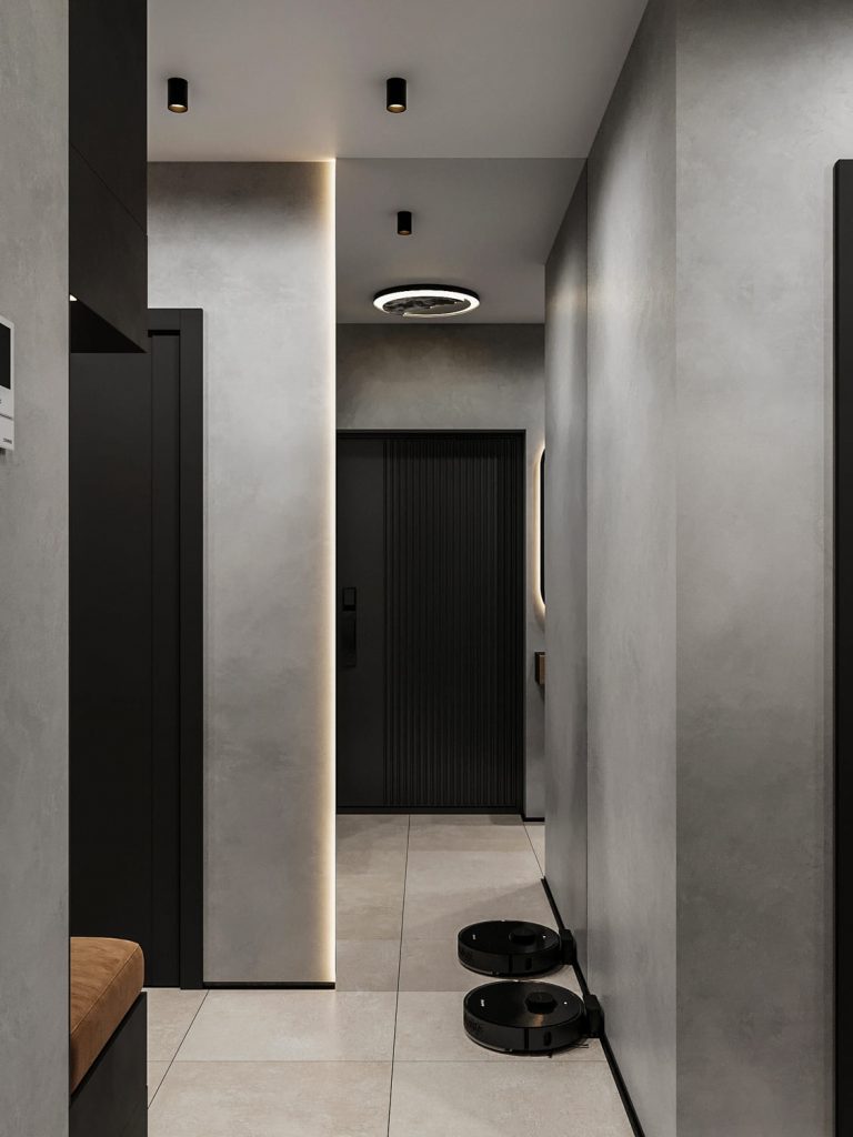 С первых шагов квартира задаёт настроение: строгая геометрия линий, контраст светлого пола и чёрных деталей, мягко подсвеченные акценты. В прихожей чётко прослеживается ритм, заданный чёрным микроплинтусом, дверями и мебелью.