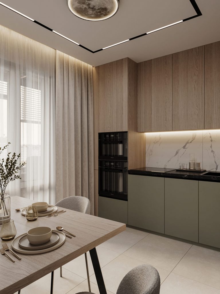 Фасады кухни выполнены в спокойных матовых оттенках — сочетание светлого дерева и приглушённого оливкового тона смотрится сдержанно и современно. Чёрная столешница и фурнитура поддерживают контрастную гамму интерьера, а встроенная подсветка вдоль рабочей зоны делает пространство удобным и атмосферным.