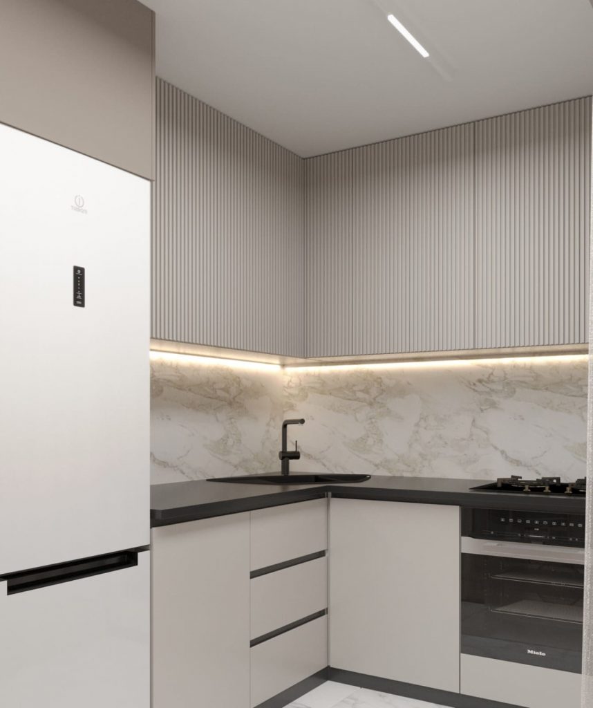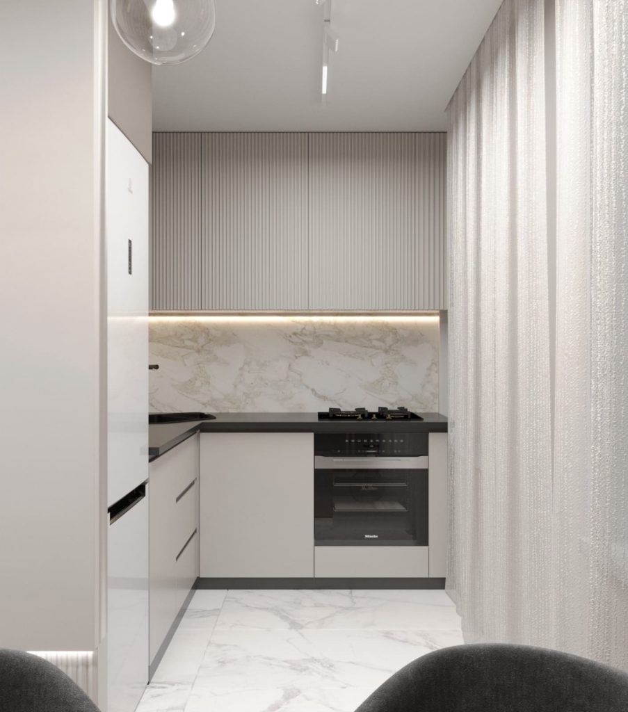 В крайне компактной кухне, представленной лишь угловым кухонным гарнитуром - единственной зоной, только самый необходимый функциональный минимум - встроенные плита, мойка, разделочный стол, холодильник, верхние шкафы для хранения. Выполнена она в стильной контрастной черно-белой гамме. Отлично помогает при приготовлении пищи яркая подсветка, вмонтирована в нижнюю часть верхних шкафов.