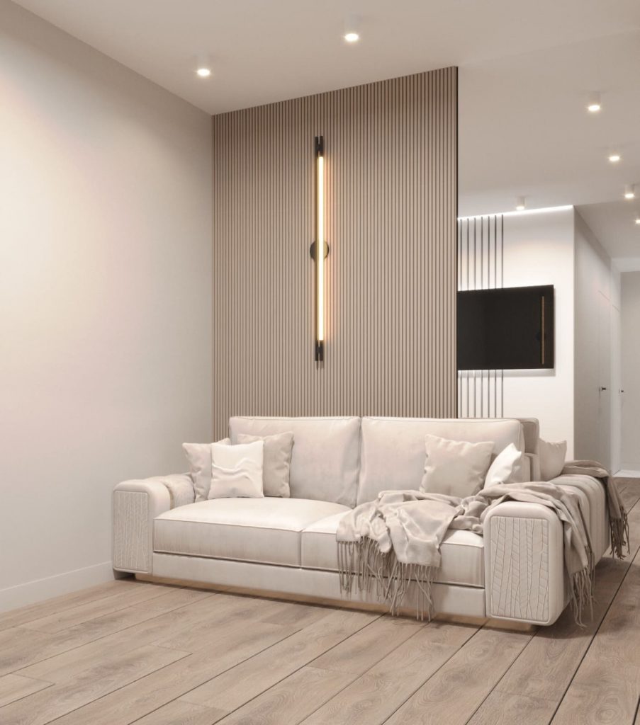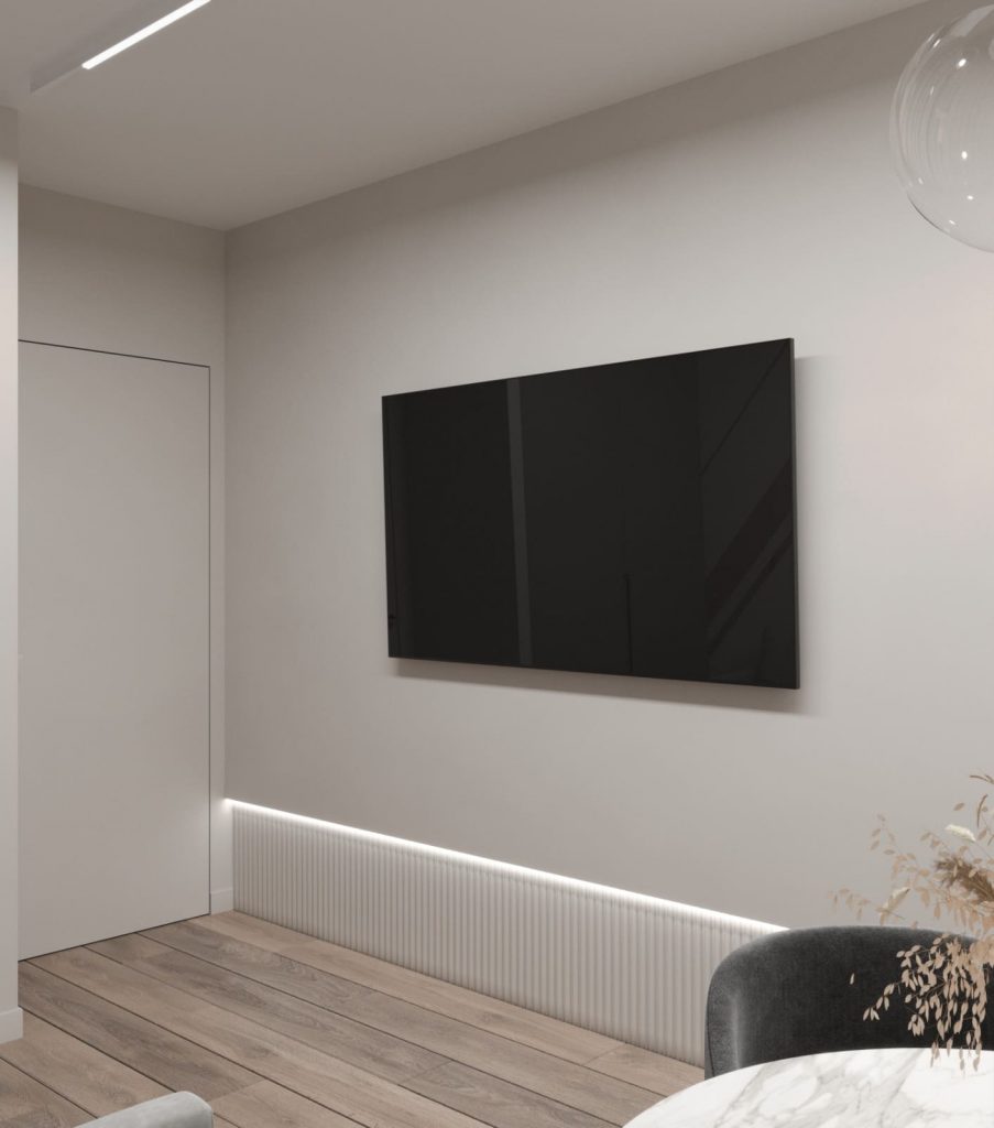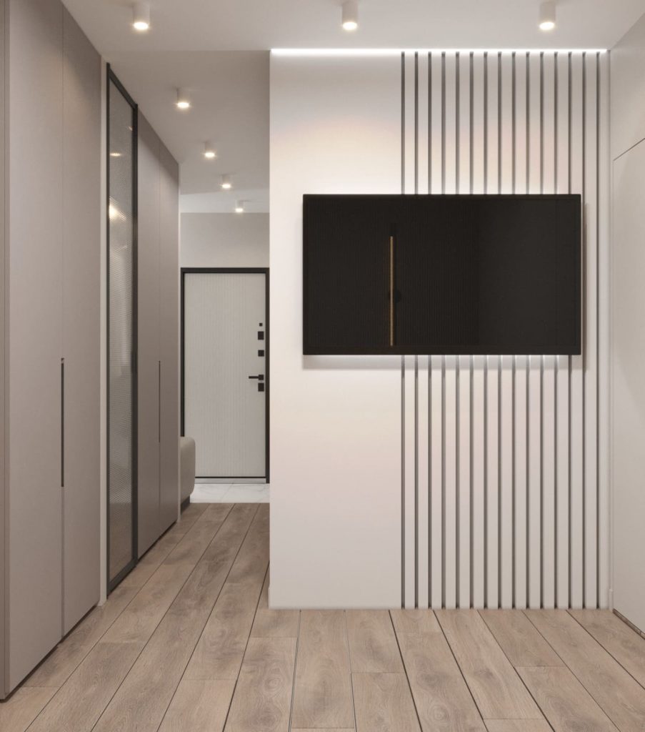 Гостиная, организованная по принципу open space c прихожей, и расположена она в центре квартиры. В ней - только компактный диван и ТВ панель на противоположной стене без ТВ тумбы, чтобы не загромождать пространство для прохода к другим комнатам. Часть стены за диваном - зеркальная, что визуально создает потрясающий эффект “зазеркалья.” Еще более очаровательной и гостеприимной делает гостиную лампа-бра с теплым светом, размещенная над диваном.