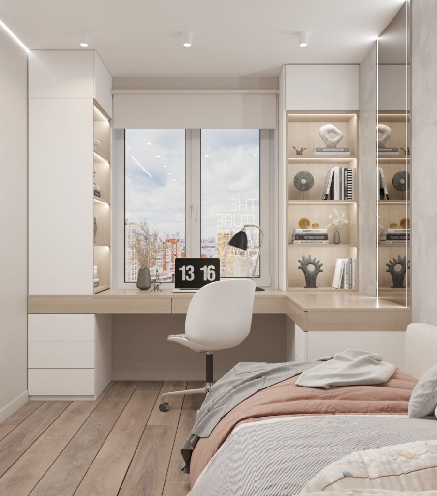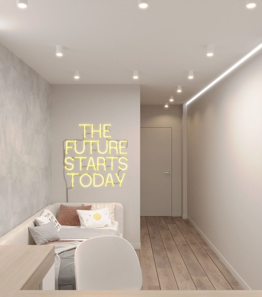Здесь - тоже комфортый диван-кровать нежного бежевого оттенка. И рабочее место оформлено в таком же стиле, как у мальчика - вместительный угловой компьютерный стол с нижними отделениями с выдвижными ящиками, удобное компьютерное кресло. На стол, как и у мальчика в спальне, поставлены книжные стеллажи, а сбоку - зеркало до потолка - в качестве небольшой бьюти-зоны. Также, у девочки имеется своя гардеробная с отдельным входом рядом со спальней. Оригинальность комнате придает светящаяся надпись над диваном-кроватью на английском - “The future starts today” с позитивным переводом - “Будущее начинается сегодня”.