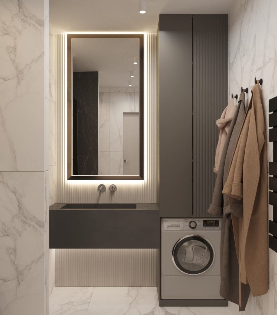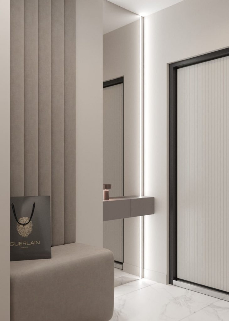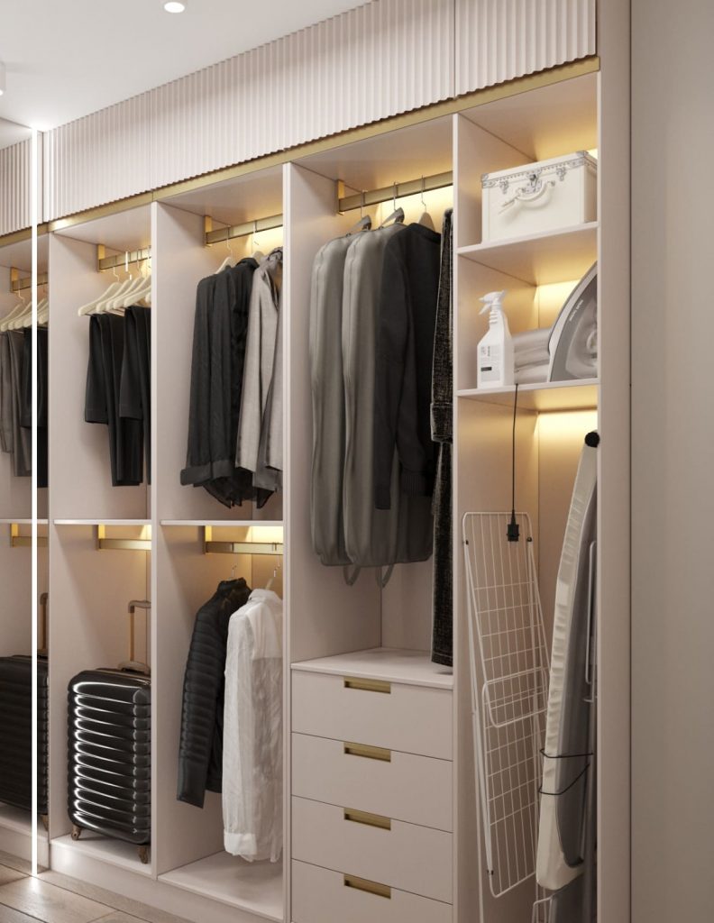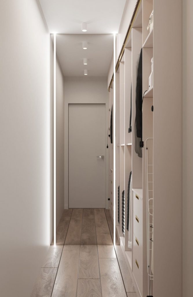 В гардеробной уютно за счет светлой отделки и теплой подсветки отделений, а ростовое зеркало в конце комнаты от пола до потолка не только позволяет подобрать лучший наряд, но и визуально увеличивает пространство вдвое.