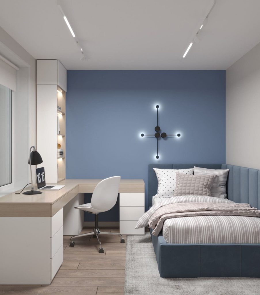 Уютнее и теплее комнату делают: ковёр, размещённый под диван-кроватью и бра над ним же. А приятный серо-голубой цвет, в котором выполнены акцентная стена спальни и обивка диван-кровати, не только делают интерьер более “мальчиковым”, но и добавляют ему стильности.