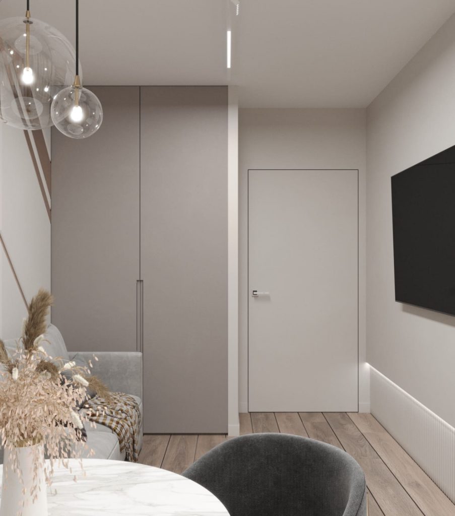 Компактный раздвижной диван в дневной время используется для отдыха хозяев и общения с гостями, а в ночное - как место для сна; напротив него размещена ТВ панель без ТВ тумбы, чтобы не мешать проходу к кухне. Также, здесь эргономично размещена небольшая обеденная зона в виде круглого стола и полукруглых, обтекаемой формы кресел-стульев.