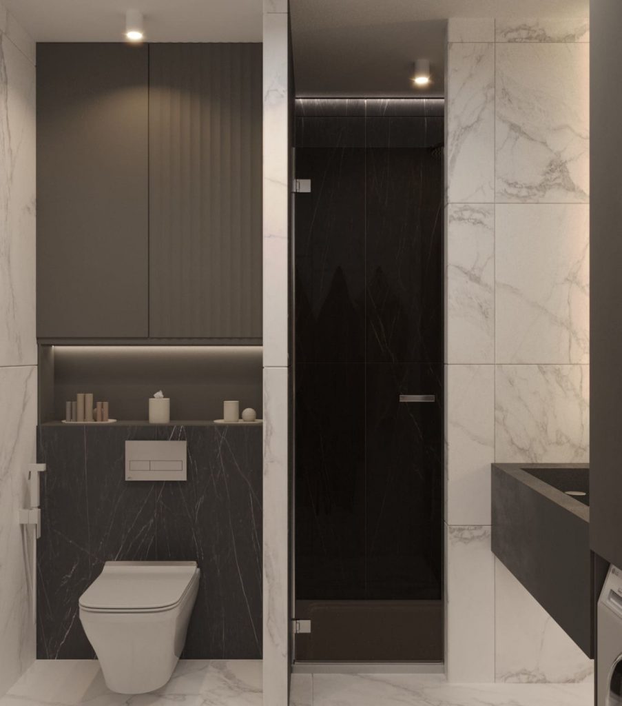 Приятная уютная ванная, выполненная в бежево-шоколадной гамме, как и хотели заказчики, объединена с санузлом. Она включает ванную, отделенную от остального помещения простенками и прозрачной дверью, лаконичную прямоугольную шоколадного оттенка раковину без тумбы под ней, подвесной унитаз, встроенную стиральную машину. Система хранения ванной - полка-ниша над унитазом, для дополнительного удобства на стене имеются крючки для полотенец и халатов и полотенцесушитель.