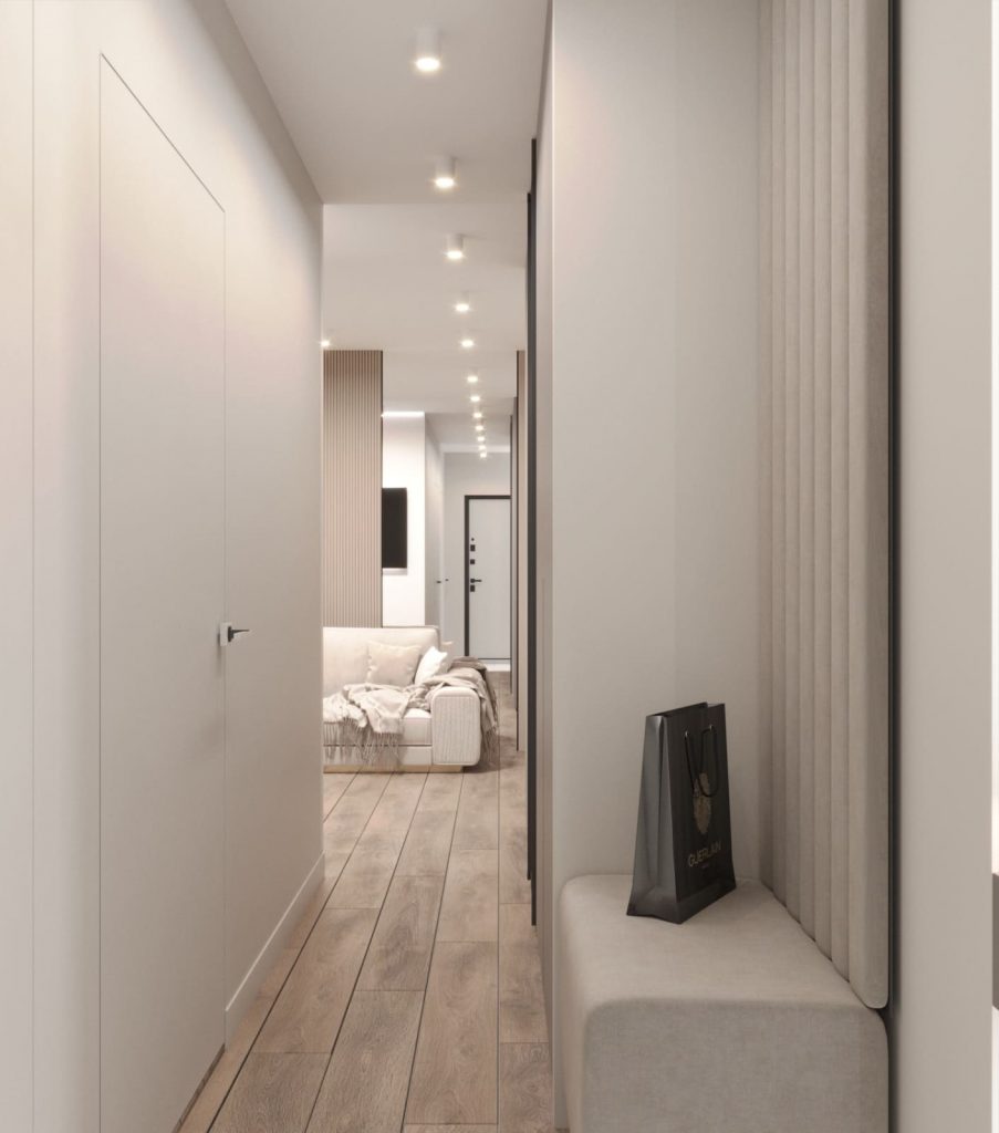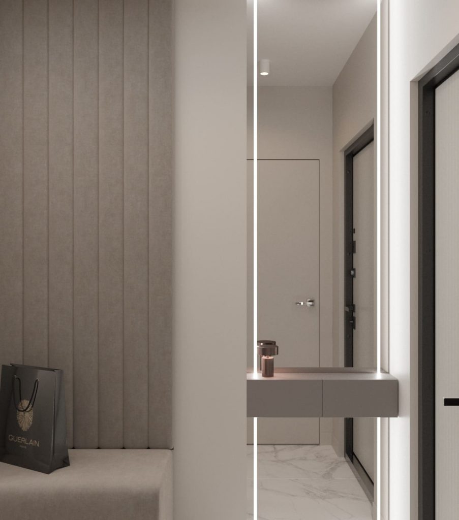 Итак, прихожая оформлена с использованием минимума функциональных элементов - здесь лишь ростовое зеркало на входе - от пола до потолка, на котором закреплена консоль для ключей, рядом - пуфик, чтобы можно было с комфортом надеть или снять обувь, дальше по коридору - большой гардеробный шкаф, в котором вся семья может хранить верхнюю одежду, потому вешалка в прихожей не требуется.