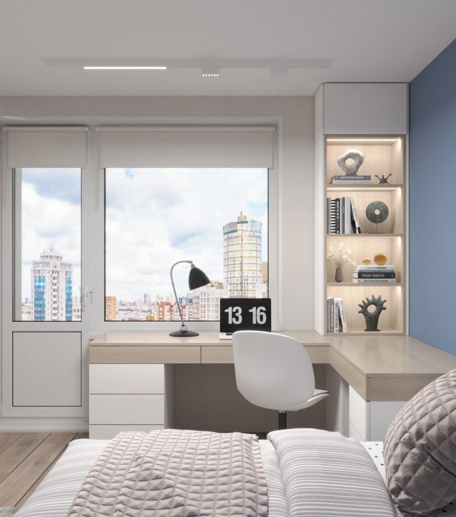 Первая включает только удобный диван-кровать с мягкими изголовьем и спинкой. Рабочее же место, расположенное практически вплотную к зоне сна, но с соблюдением эргономических норм, представлено большим угловым компьютерным столом с тремя нижними отделениями с выдвижными ящиками, в которых можно разместить всё необходимое для учёбы и не только. Дополнен стол удобным компьютерным креслом. На стол поставлен книжный шкаф-стеллаж с открытыми полками.