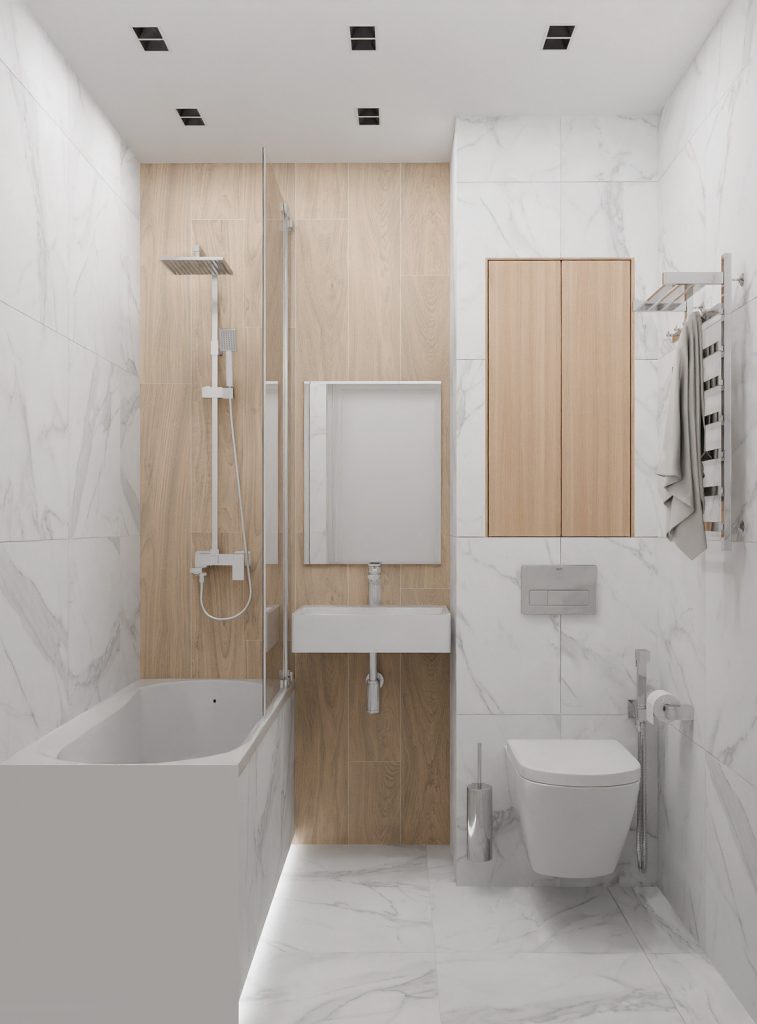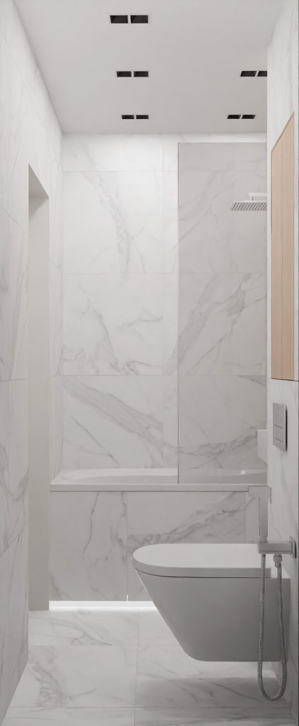 Стены и пол санузла облицованы крупноформатной плиткой под белый мрамор с выразительным серым рисунком. Это решение не только визуально расширяет пространство, но и делает интерьер более благородным. Деревянные вставки добавляют тепла и уюта, уравновешивая прохладу мраморных поверхностей.