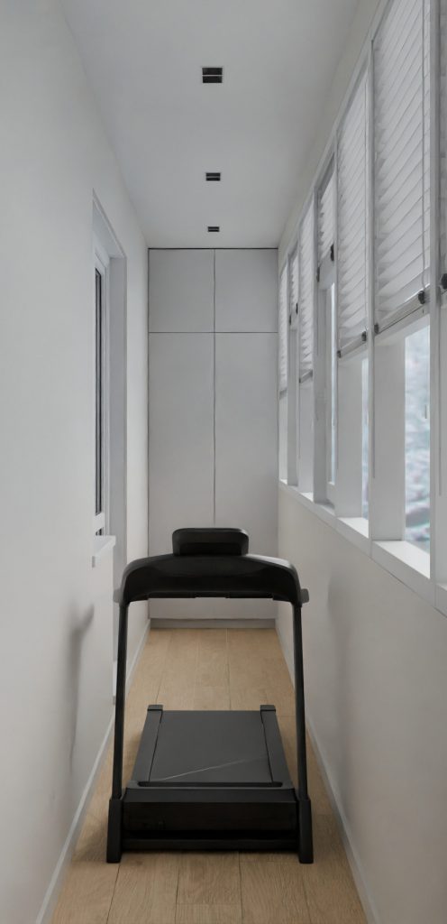 Спортивная зона — в центре балкона расположена беговая дорожка, что делает его удобным местом для тренировок с хорошей естественной вентиляцией.