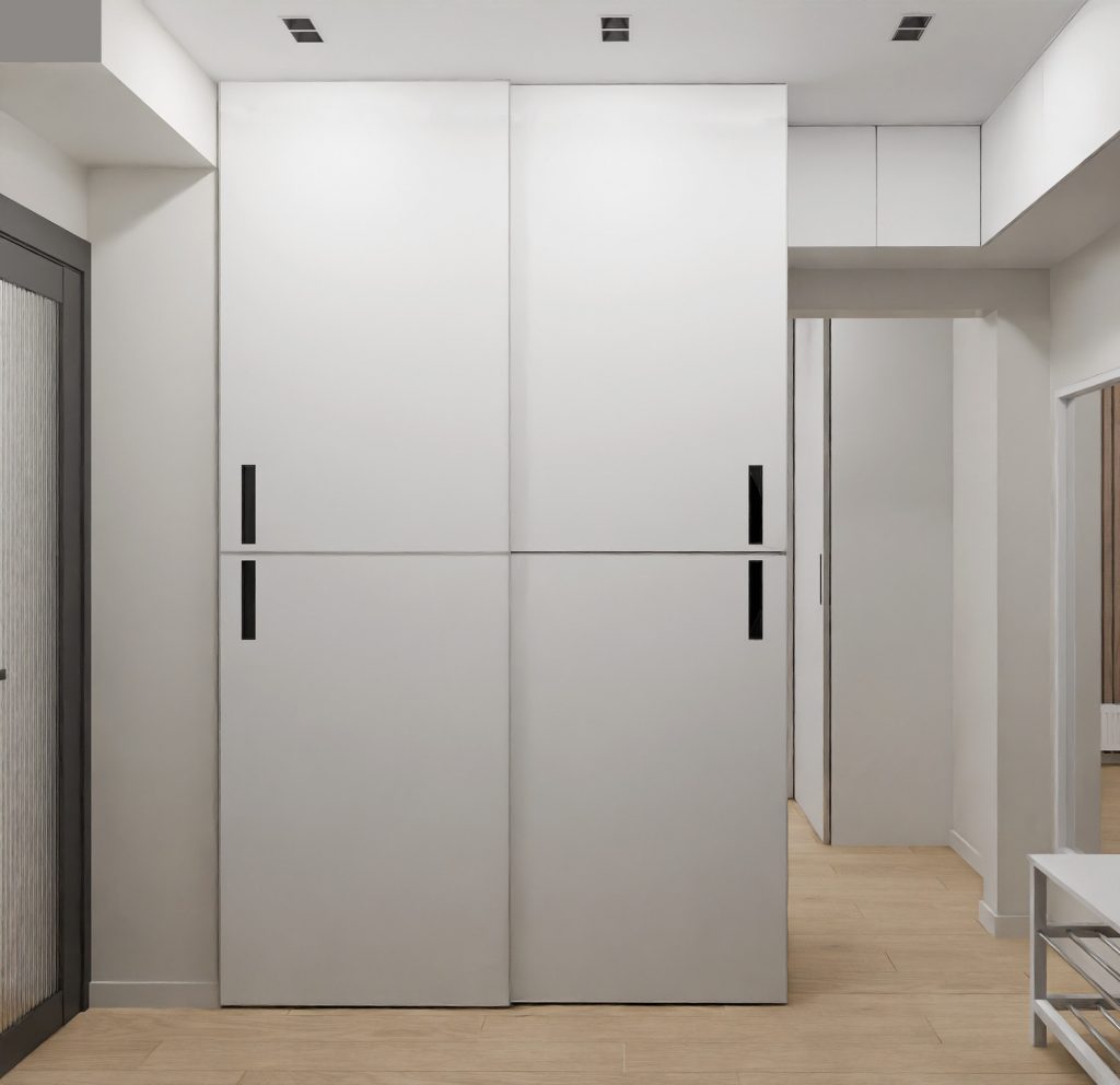 Встроенные шкафы в прихожей до потолка обеспечивают вместительное хранение, а антресоли позволяют использовать каждый сантиметр пространства. Компактная белая скамья с полками для обуви дополняет зону у входа, создавая удобное место для переобувания.
