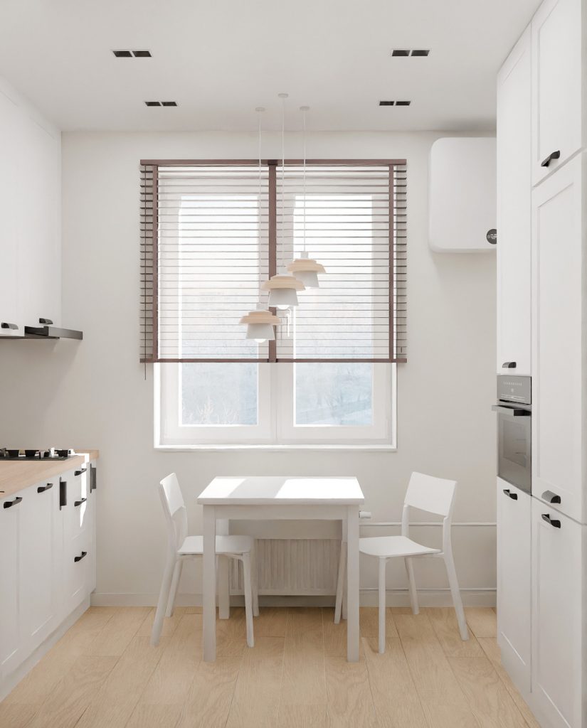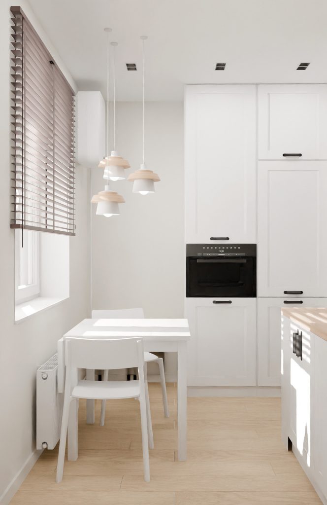 Обеденная зона у окна выполнена в минималистичном стиле: компактный белый стол и лёгкие стулья идеально вписываются в концепцию светлого, воздушного интерьера. Подвесные светильники с деревянными элементами создают мягкий акцент и делают пространство более уютным.