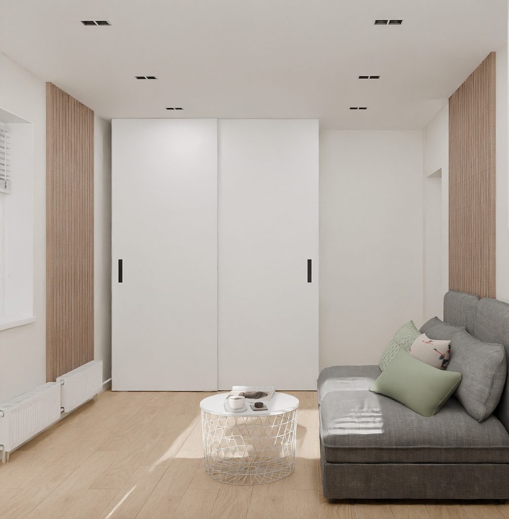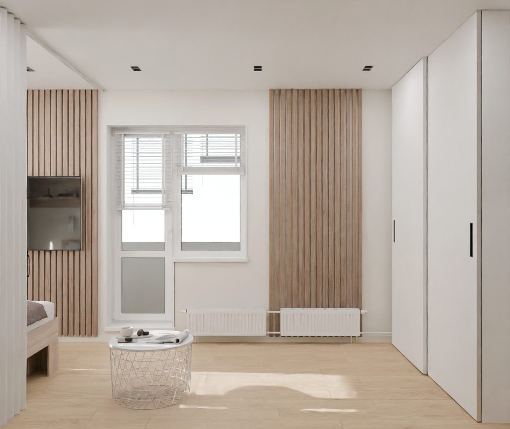 Дизайн-проект однокомнатной квартиры в брежневке для пары в светлых оттенках с акцентами из декоративных реек и натуральных текстур с прихожей, кухней, комнатой (гостиная и спальня объединены), санузлом и балконом