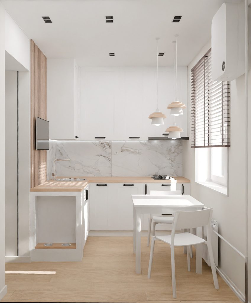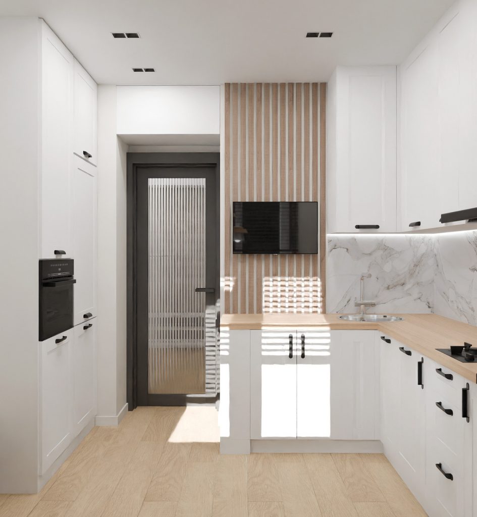 Белые фасады кухонного гарнитура с лаконичными чёрными ручками создают стильный контраст, а мраморный фартук добавляет интерьеру нотку благородства. Деревянные столешницы и декоративные рейки на стенах привносят тепло и естественность, подчёркивая скандинавский стиль.
