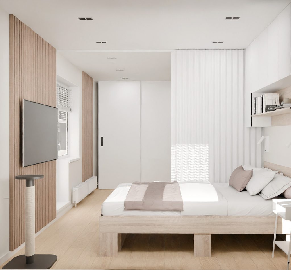 Деревянные рейки на стенах добавляют интерьеру тепла и естественности, создавая ощущение спокойствия. Напротив кровати — телевизор, встроенный в деревянную акцентную стену, а рядом — когтеточка, продуманное решение для комфортного проживания питомца.