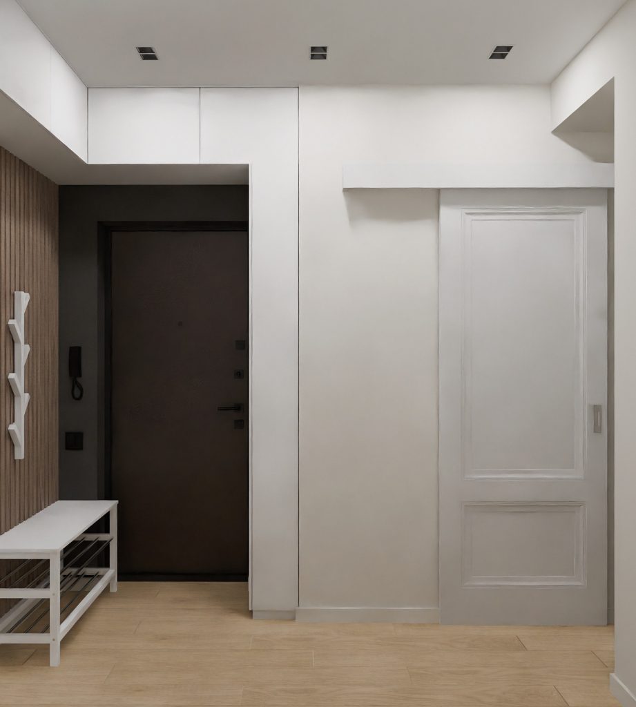Дверь с рифленым стеклом ведёт в основную часть квартиры, пропуская свет, но сохраняя приватность. Черные акценты на фурнитуре и межкомнатных дверях создают современный контраст, подчеркивая лаконичность дизайна.