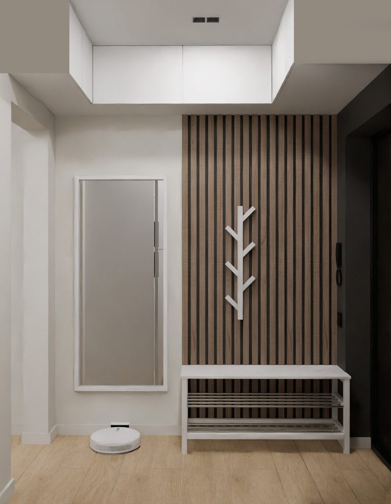 Белые стены и светлый кварцвинил на полу создают нейтральный фон, который наполняет пространство светом. Декоративные деревянные рейки добавляют интерьеру текстуры и подчёркивают естественную, скандинавскую эстетику.