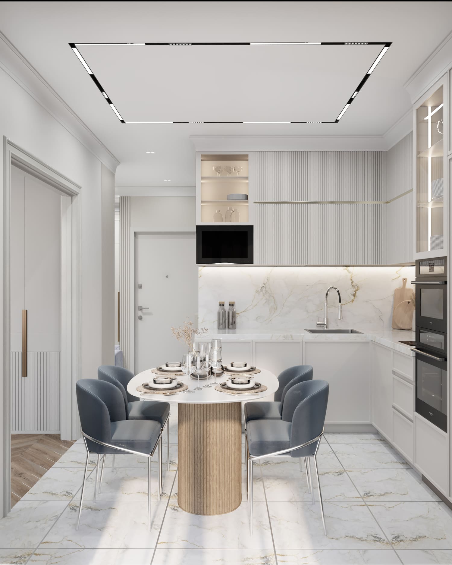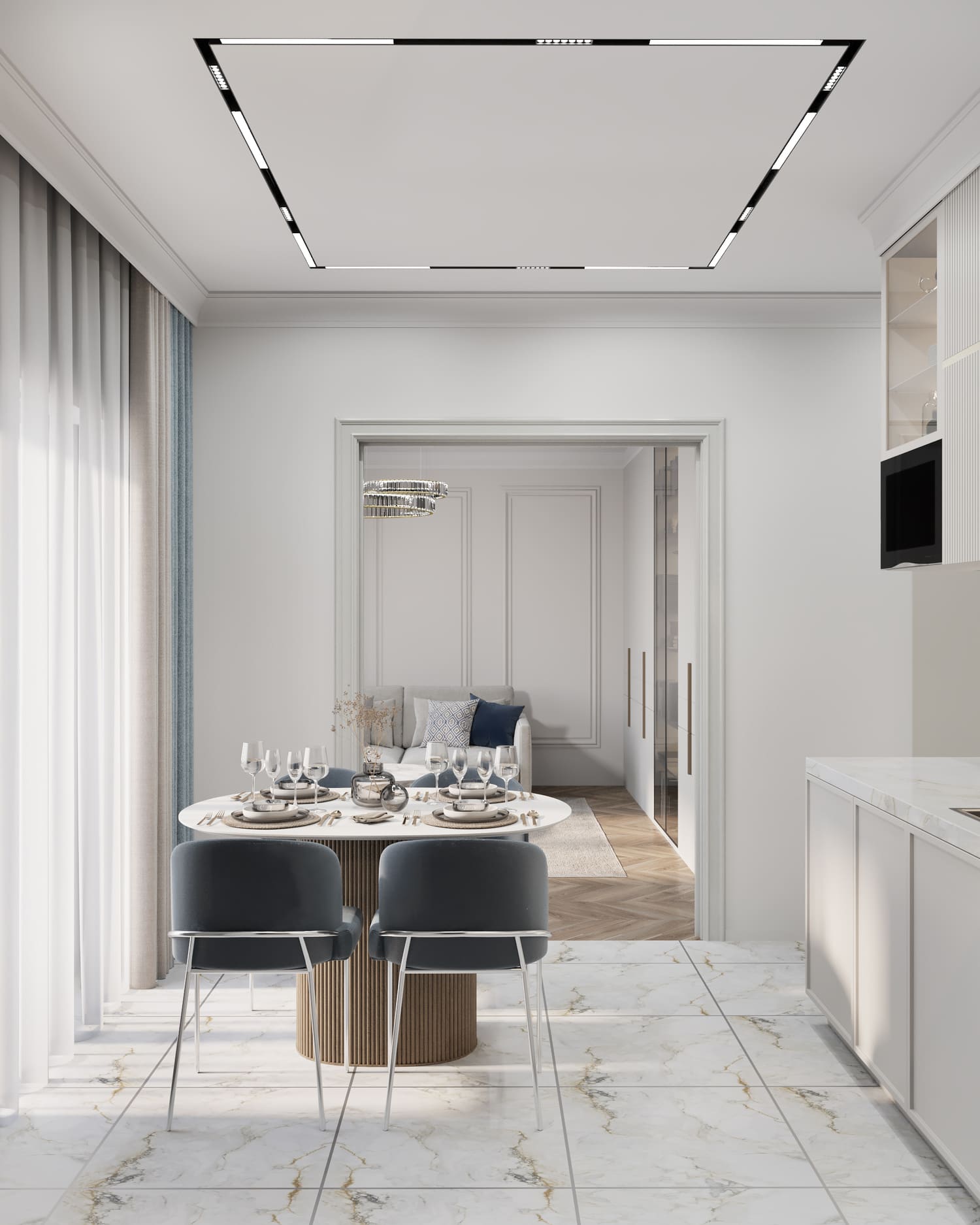 Светлые фасады без лишнего декора и мраморный фартук создают ощущение воздушности, а встроенная техника позволяет сохранить лаконичный облик пространства. Обеденная зона оформлена элегантным овальным столом на рифлёной деревянной ножке. Вокруг — мягкие стулья глубокого синего оттенка, которые становятся цветовым акцентом и подчёркивают изысканность интерьера. Большие окна с лёгкими светлыми шторами наполняют кухню естественным светом, а плотные портьеры небесно-голубого цвета создают приватность, когда это нужно.