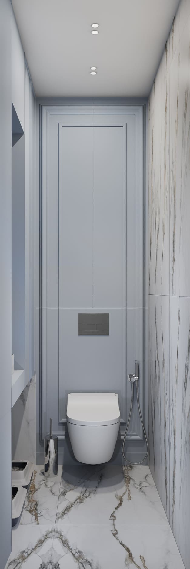 Санузел выполнен в единой концепции с ванной, но имеет свой акцент — небесно-голубые фасады шкафов. Они создают ощущение свежести и визуально облегчают пространство.