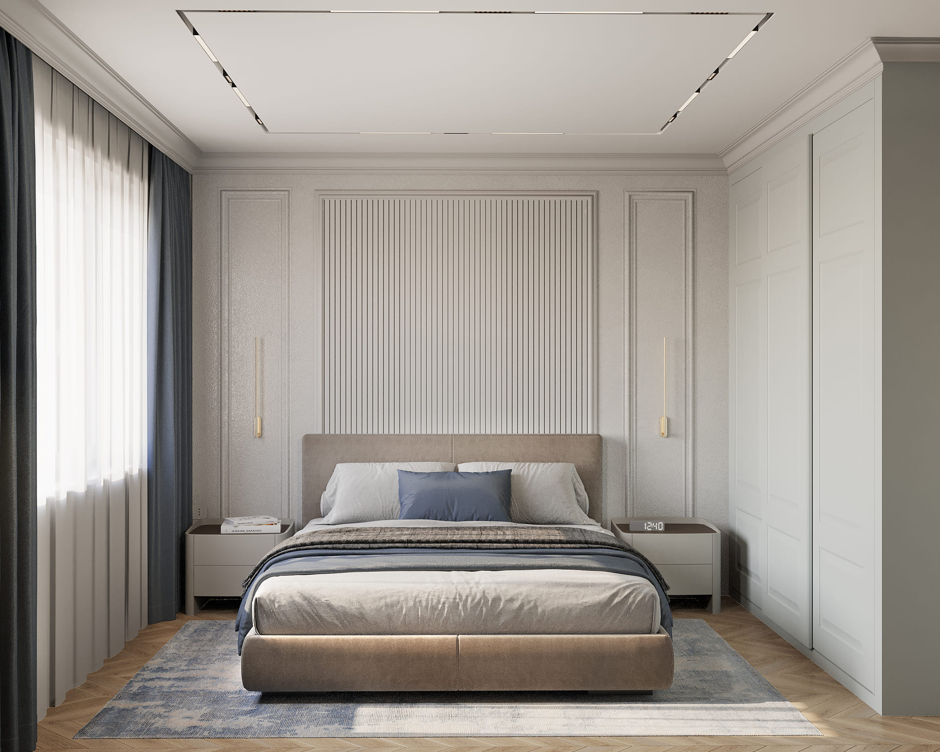 В центре — мягкая кровать с обивкой в нейтральных оттенках и высоким изголовьем, которое подчёркнуто декоративной панелью с вертикальным рельефом. Такой приём делает интерьер глубже и добавляет ощущение камерности.